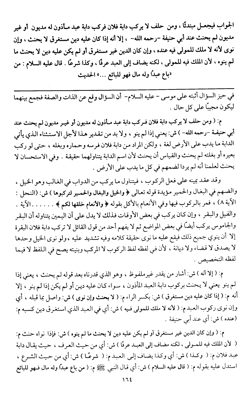 م: (وإن كان الدين غير مستغرق أو لم يكن عليه دين لا يحنث ما لم ينوه) ش: فإذا نواه حنث م: (لأن الملك فيه للمولى، لكنه مضاف إلى العبد عرفًا) ش: أي من حيث العرف، حيث يقال دابة عبد فلان م: (وكذا) ش: أي وكذا يضاف إلى العبد م: (شرعًا) ش: أي من حيث الشرع، استدل عليه بقوله م: (قال - عَلَيْهِ السَّلَامُ -) ش: أي قال النبي - صَلَّى اللَّهُ عَلَيْهِ وَسَلَّمَ - م: «من باع عبدًا وله مال فهو للبائع»