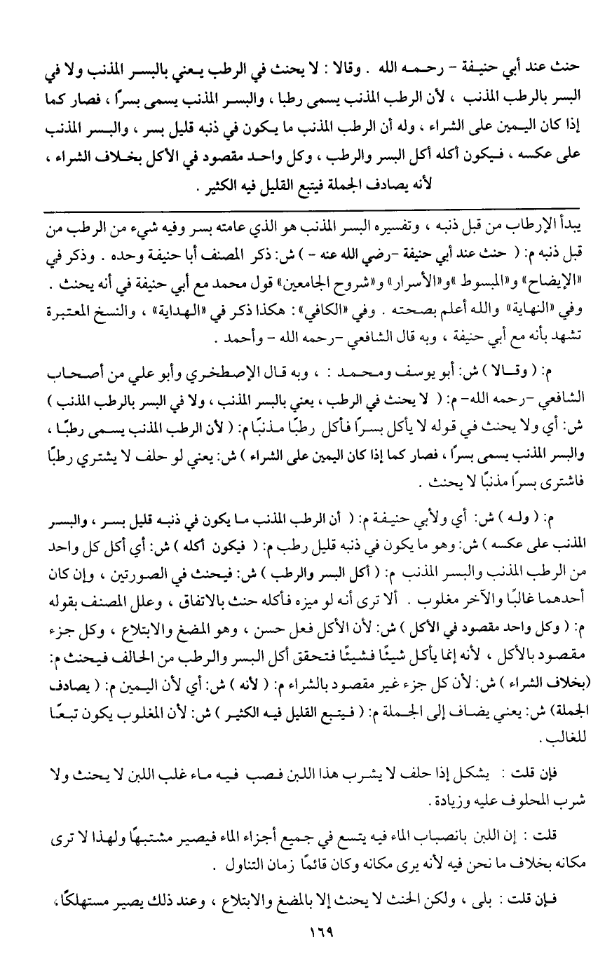 ـــــــــــــــــــــــــــــQيبدأ الإرطاب من قبل ذنبه، وتفسيره البسر المذنب هو الذي عامته بسر وفيه شيء من الرطب من قبل ذنبه م: (حنث عند أبي حنيفة - رَضِيَ اللَّهُ عَنْهُ -) ش: ذكر المصنف أبا حنيفة وحده. وذكر في " الإيضاح " و " المبسوط " و " الأسرار " و " شروح الجامعين " قول محمد مع أبي حنيفة في أنه يحنث. وفي " النهاية " والله أعلم بصحته. وفي " الكافي ": هكذا ذكر في " الهداية " والنسخ المعتبرة تشهد بأنه مع أبي حنيفة، وبه قال الشافعي - رَحِمَهُ اللَّهُ - وأحمد.