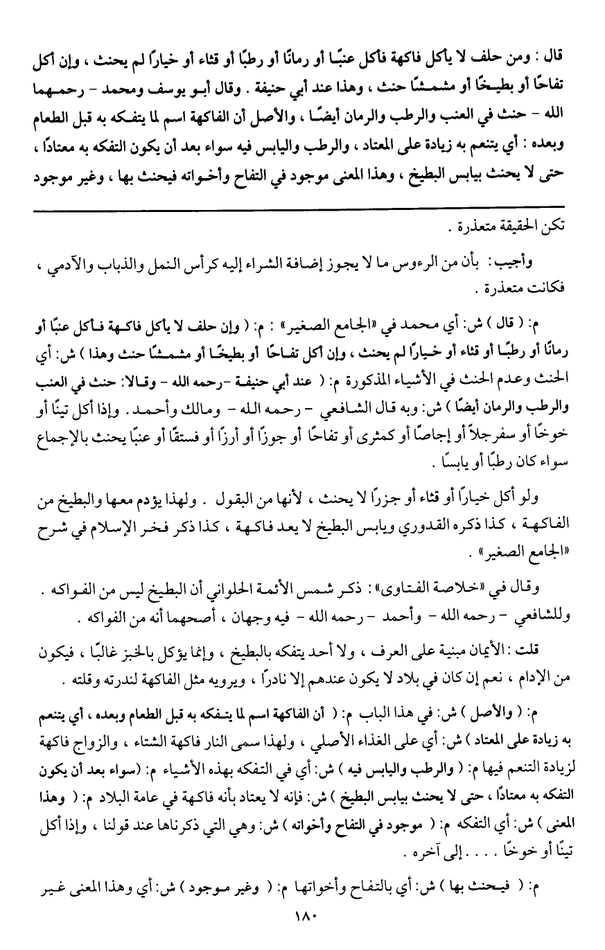 قال: ومن حلف لا يأكل فاكهة فأكل عنبا أو رمانا أو رطبا أو قثاء أو خيارا لم يحنث، وإن أكل تفاحا أو بطيخا أو مشمشا حنث، وهذا عند أبي حنيفة. وقال أبو يوسف ومحمد - رحمهما الله - حنث في العنب والرطب والرمان أيضا، والأصل أن الفاكهة اسم لما يتفكه به قبل الطعام وبعده: أي يتنعم به زيادة على المعتاد، والرطب واليابس فيه سواء بعد أن يكون التفكه به معتادا، حتى لا يحنث بيابس البطيخ، وهذا المعنى موجود في التفاح وأخواته فيحنث بها، وغير موجود