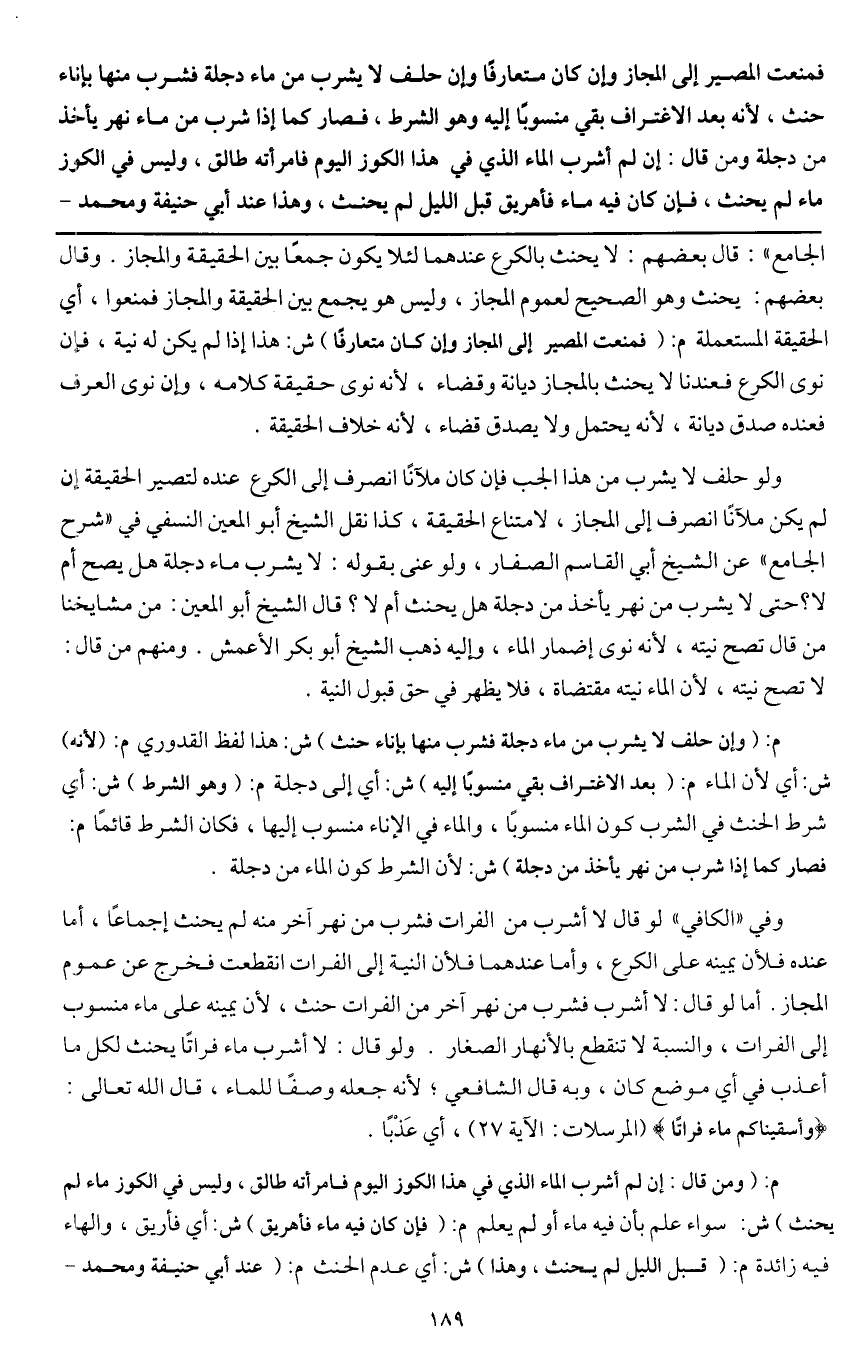 فمنعت المصير إلى المجاز وإن كان متعارفا وإن حلف لا يشرب من ماء دجلة فشرب منها بإناء حنث، لأنه بعد الاغتراف بقي منسوبا إليه وهو الشرط، فصار كما إذا شرب من ماء نهر يأخذ من دجلة