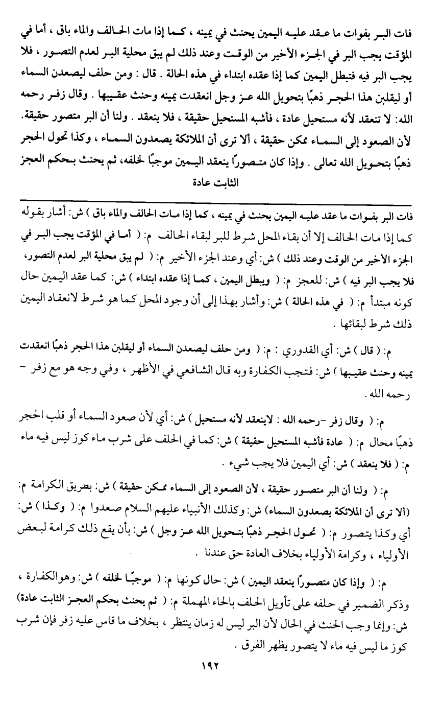قال: ومن حلف ليصعدن السماء أو ليقلبن هذا الحجر ذهبا بتحويل الله عز وجل انعقدت يمينه وحنث عقيبها. وقال زفر - رَحِمَهُ اللَّهُ -: لا تنعقد لأنه مستحيل عادة، فأشبه المستحيل حقيقة، فلا ينعقد. ولنا أن البر متصور حقيقة. لأن الصعود إلى السماء ممكن حقيقة، ألا ترى أن الملائكة يصعدون السماء، وكذا تحول الحجر ذهبا بتحويل الله تعالى. وإذا كان متصورا ينعقد اليمين موجبا لخلفه، ثم يحنث بحكم العجز الثابت عادة