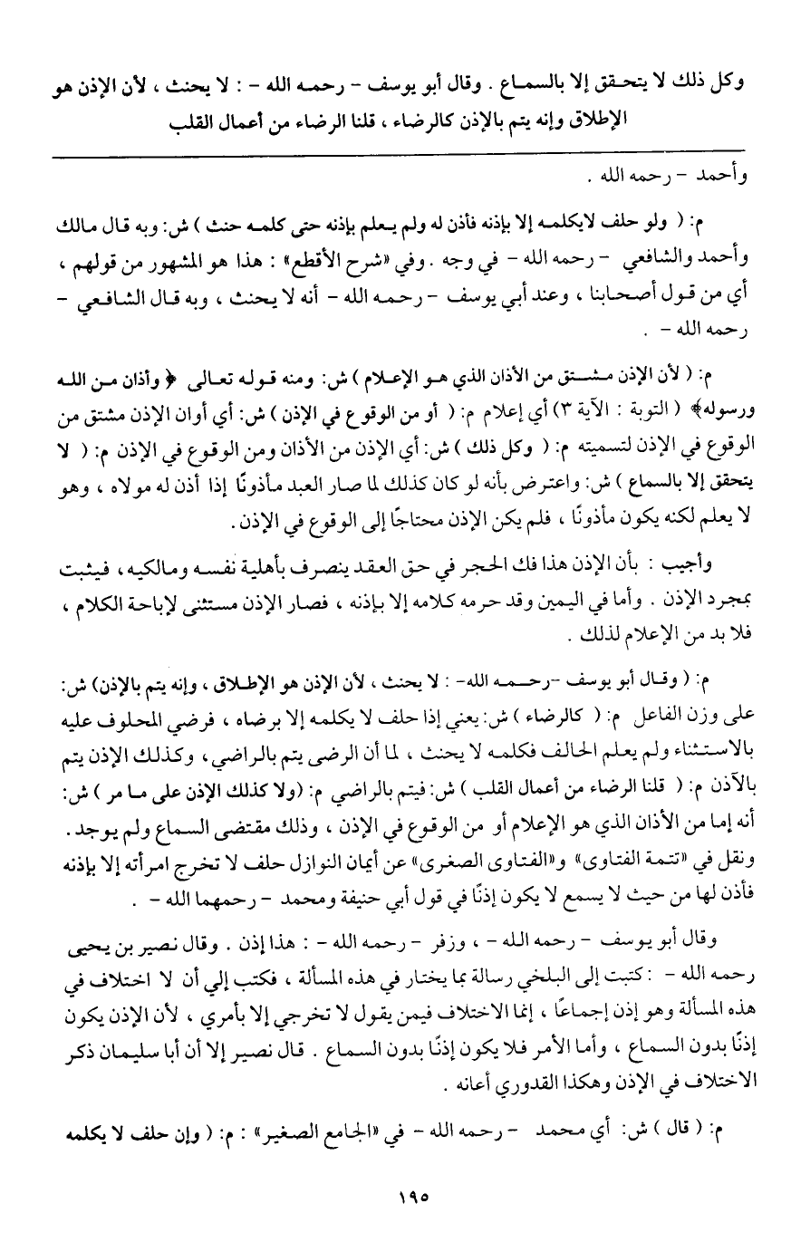 وكل ذلك لا يتحقق إلا بالسماع. وقال أبو يوسف - رَحِمَهُ اللَّهُ -: لا يحنث، لأن الإذن هو الإطلاق وإنه يتم بالإذن كالرضاء، قلنا الرضاء من أعمال القلب