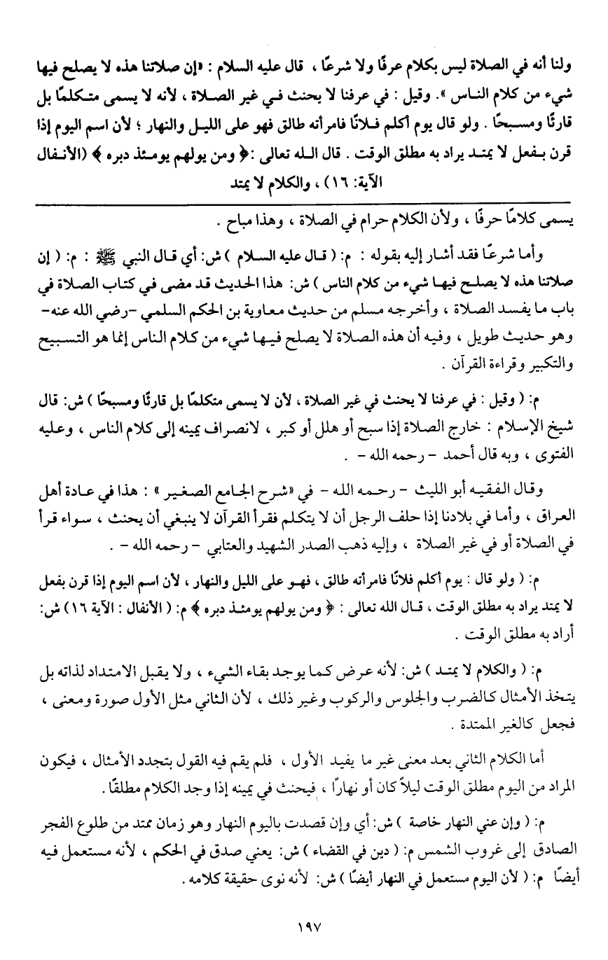 م: (وقيل: في عرفنا لا يحنث في غير الصلاة، لأن لا يسمى متكلمًا بل قارئًا ومسبحًا) ش: قال شيخ الإسلام: خارج الصلاة إذا سبح أو هلل أو كبر، لانصراف يمينه إلى كلام الناس، وعليه الفتوى، وبه قال أحمد - رَحِمَهُ اللَّهُ -.