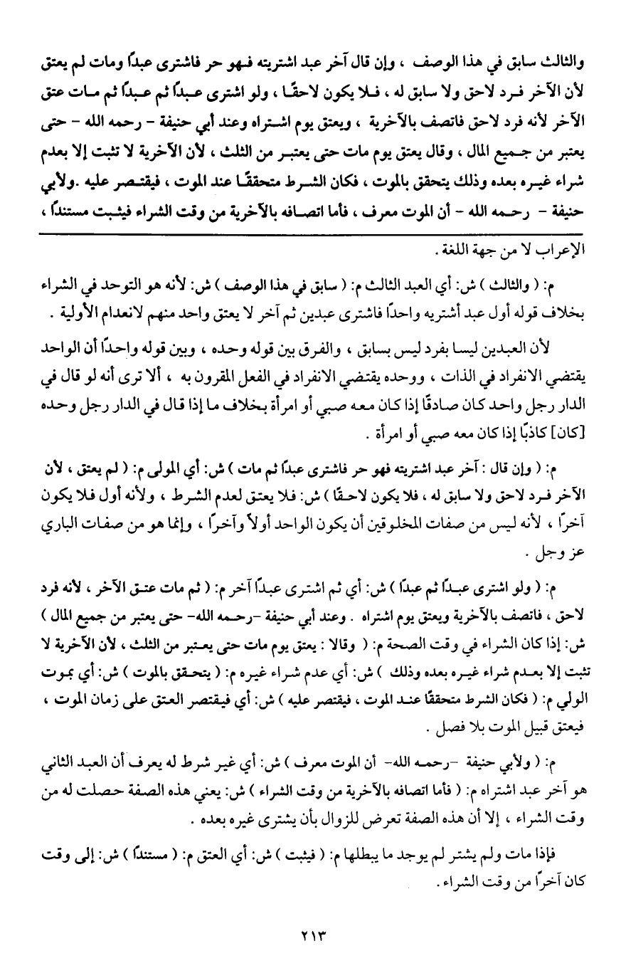 م: (وإن قال: آخر عبد اشتريته فهو حر فاشترى عبدًا ثم مات) ش: أي المولى م: (لم يعتق، لأن الآخر فرد لاحق ولا سابق له، فلا يكون لاحقًا) ش: فلا يعتق لعدم الشرط، ولأنه أول فلا يكون آخرًا، لأنه ليس من صفات المخلوقين أن يكون الواحد أولًا وآخرًا، وإنما هو من صفات الباري عز وجل.