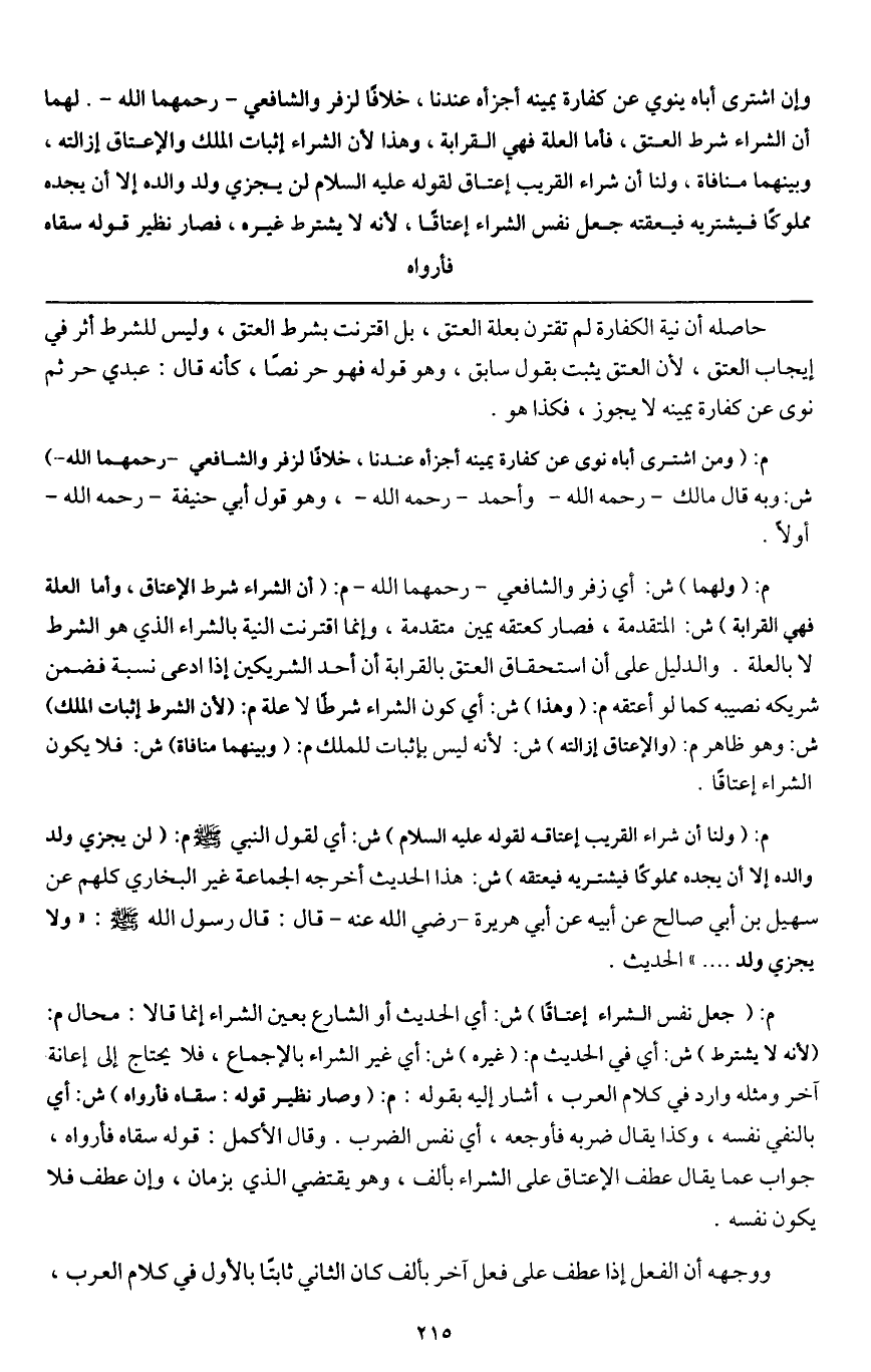 م: (جعل نفس الشراء إعتاقًا) ش: أي الحديث أو الشارع بعين الشراء إنما قالا: محال م: (لأنه لا يشترط) ش: أي في الحديث م: (غيره) ش: أي غير الشراء بالإجماع، فلا يحتاج إلى إعانة آخر ومثله وارد في كلام العرب، أشار إليه بقوله: م: (وصار نظير قوله: سقاه فأرواه) ش: أي بالنفي نفسه، وكذا يقال ضربه فأوجعه، أي نفس الضرب. وقال الأكمل: قوله سقاه فأرواه، جواب عما يقال عطف الإعتاق على الشراء بألف، وهو يقتضي الذي بزمان، وإن عطف فلا يكون نفسه.