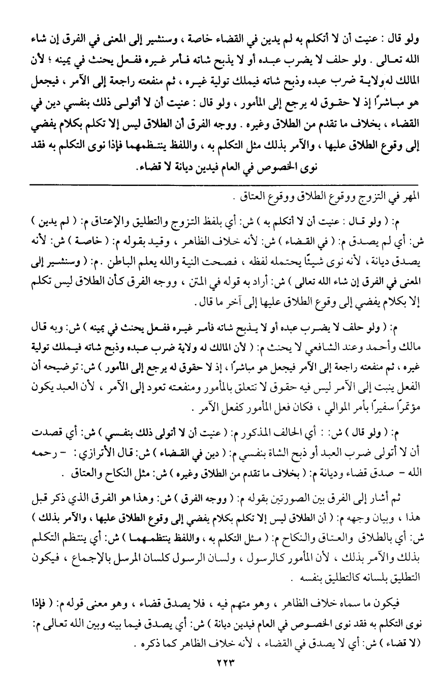 ولو قال: عنيت أن لا أتكلم به لم يدين في القضاء خاصة، وسنشير إلى المعنى في الفرق إن شاء الله تعالى. ولو حلف لا يضرب عبده أو لا يذبح شاته فأمر غيره ففعل يحنث في يمينه؛ لأن المالك له ولاية ضرب عبده وذبح شاته فيملك تولية غيره، ثم منفعته راجعة إلى الآمر، فيجعل هو مباشرا إذ لا حقوق له يرجع إلى المأمور، ولو قال: عنيت أن لا أتولى ذلك بنفسي دين في القضاء، بخلاف ما تقدم من الطلاق وغيره. ووجه الفرق أن الطلاق ليس إلا تكلم بكلام يفضي إلى وقوع الطلاق عليها، والآمر بذلك مثل التكلم به، واللفظ ينتظمهما فإذا نوى التكلم به فقد نوى الخصوص في العام فيدين ديانة لا قضاء.