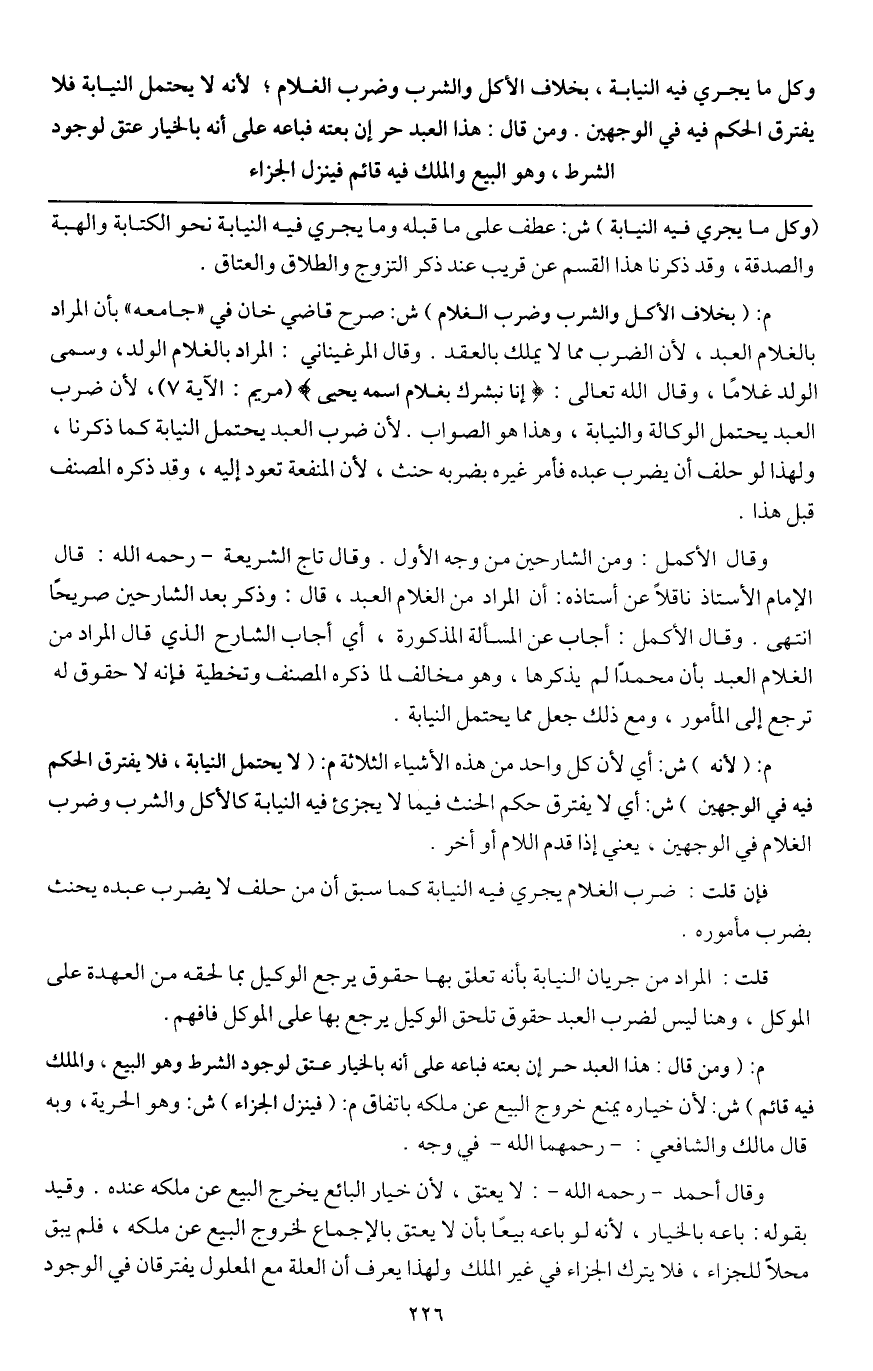 وقال الأكمل: ومن الشارحين من وجه الأول. وقال تاج الشريعة - رَحِمَهُ اللَّهُ -: قال الإمام الأستاذ ناقلًا عن أستاذه: أن المراد من الغلام العبد، قال: وذكر بعد الشارحين صريحًا انتهى. وقال الأكمل: أجاب عن المسألة المذكورة، أي أجاب الشارح الذي قال المراد من الغلام العبد بأن محمدًا لم يذكرها، وهو مخالف لما ذكره المصنف وتخطية فإنه لا حقوق له ترجع إلى المأمور، ومع ذلك جعل مما يحتمل النيابة.