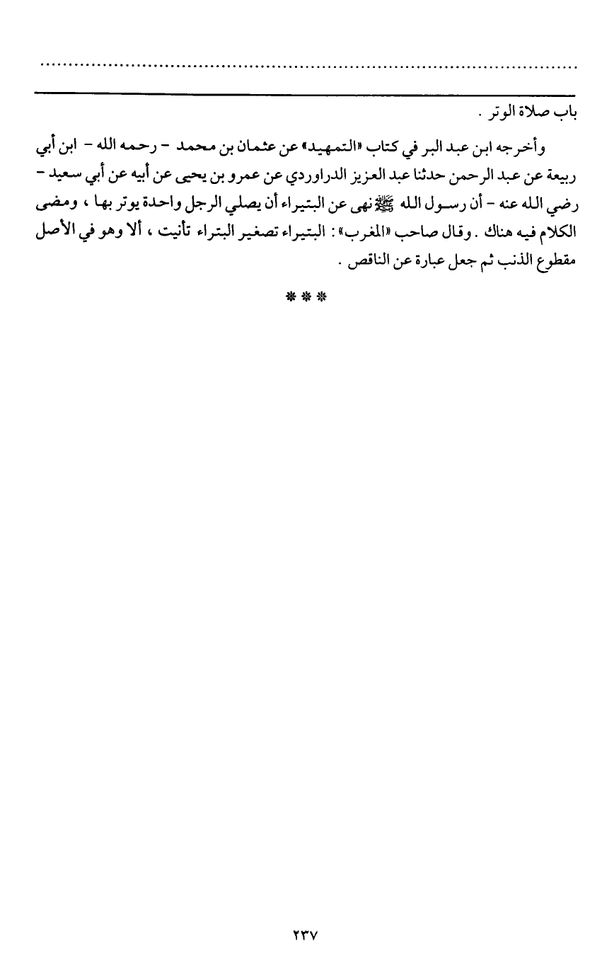 ـــــــــــــــــــــــــــــQباب صلاة الوتر وأخرجه ابن عبد البر في كتاب التمهيد عن عثمان بن محمد - رَحِمَهُ اللَّهُ - ابن أبي ربيعة عن عبد الرحمن حدثنا عبد العزيز الدراوردي عن عمرو بن يحيى عن أبيه عن أبي سعيد - رَضِيَ اللَّهُ عَنْهُ - «أن رسول الله - صَلَّى اللَّهُ عَلَيْهِ وَسَلَّمَ - نهى عن البتيراء أن يصلي الرجل واحدة يوتر بها» ومضى الكلام فيه هناك. وقال صاحب " المغرب ": البتيراء تصغير البتراء تأنيت، ألا وهو في الأصل مقطوع الذنب ثم جعل عبارة عن الناقص.