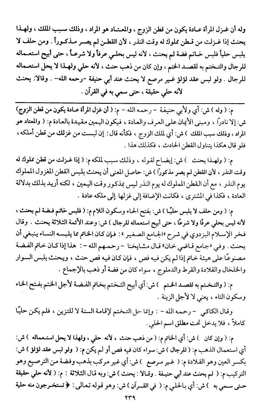 ومن حلف لا يلبس حليا فلبس خاتم فضة لم يحنث، لأنه ليس بحلي عرفا ولا شرعا، حتى أبيح استعماله للرجال والتختم به لقصد الختم، وإن كان من ذهب حنث، لأنه حلي ولهذا لا يحل استعماله للرجال. ولو لبس عقد لؤلؤ غير مرصع لا يحنث عند أبي حنيفة - رَحِمَهُ اللَّهُ -. وقالا: يحنث لأنه حلي حقيقة، حتى سمي به في القرآن.