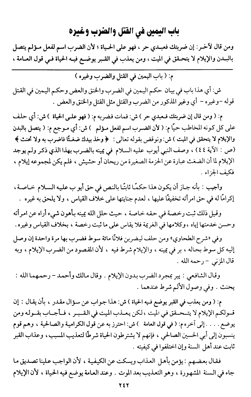 باب اليمين في القتل والضرب وغيره ومن قال لآخر: إن ضربتك فعبدي حر، فهو على الحياة؛ لأن الضرب اسم لفعل مؤلم يتصل بالبدن والإيلام لا يتحقق في الميت، ومن يعذب في القبر يوضع فيه الحياة في قول العامة،