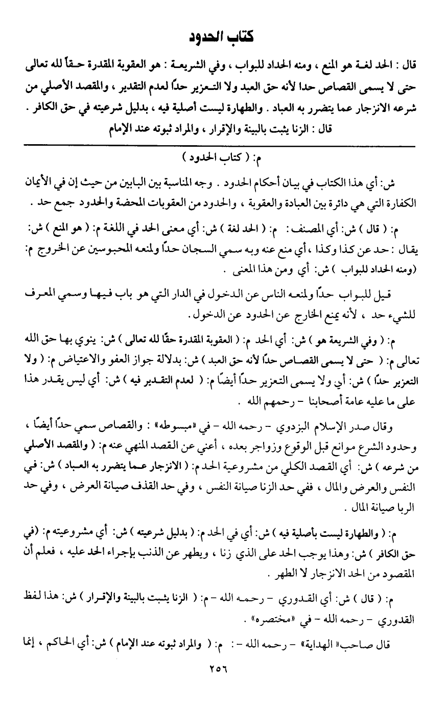 كتاب الحدود قال: الحد لغة هو المنع، ومنه الحداد للبواب، وفي الشريعة: هو العقوبة المقدرة حقا لله تعالى حتى لا يسمى القصاص حدا لأنه حق العبد ولا التعزير حدا لعدم التقدير، والمقصد الأصلي من شرعه الانزجار عما يتضرر به العباد. والطهارة ليست أصلية فيه، بدليل شرعيته في حق الكافر.