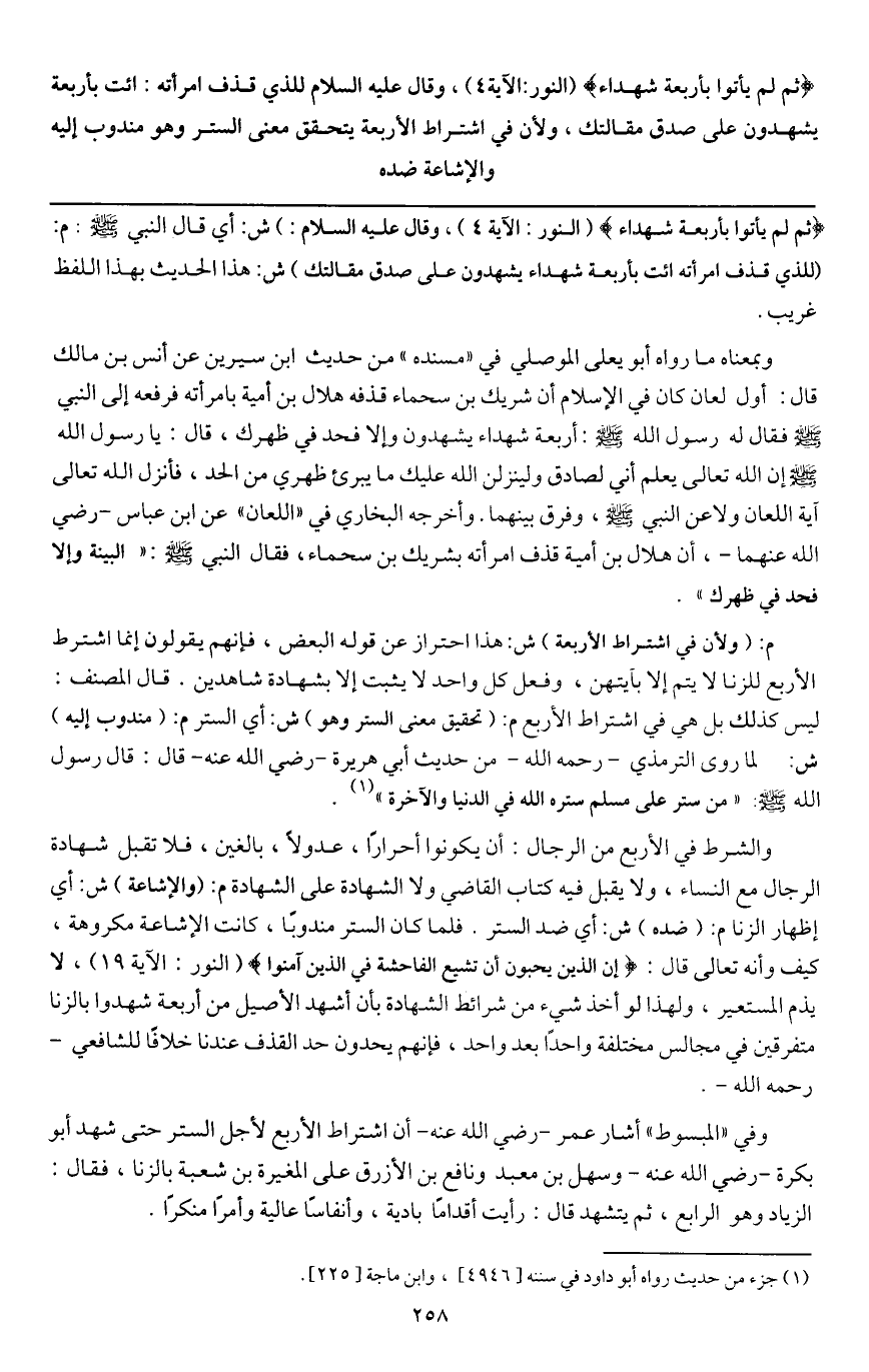{ثُمَّ لَمْ يَأْتُوا بِأَرْبَعَةِ شُهَدَاءَ} [النور: 4] (النور: الآية 4) ، وقال - عَلَيْهِ السَّلَامُ - للذي قذف امرأته: ائت بأربعة يشهدون على صدق مقالتك، ولأن في اشتراط الأربعة يتحقق معنى الستر وهو مندوب إليه والإشاعة ضده