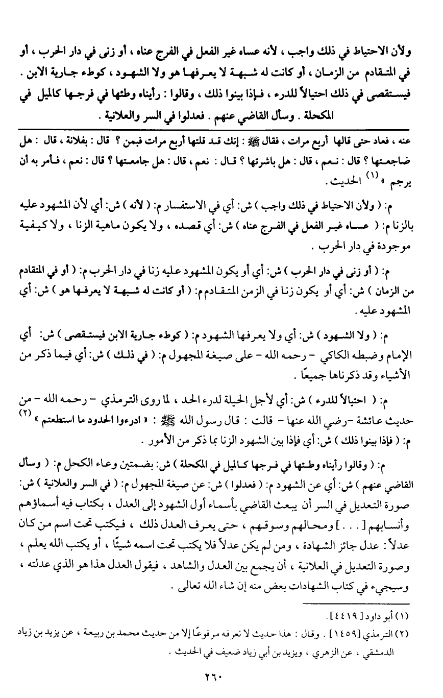 ولأن الاحتياط في ذلك واجب، لأنه عساه غير الفعل في الفرج عناه، أو زنى في دار الحرب، أو في المتقادم من الزمان، أو كانت له شبهة لا يعرفها هو ولا الشهود، كوطء جارية الابن. فيستقصى في ذلك احتيالا للدرء، فإذا بينوا ذلك، وقالوا: رأيناه وطئها في فرجها كالميل في المكحلة. وسأل القاضي عنهم. فعدلوا في السر والعلانية.