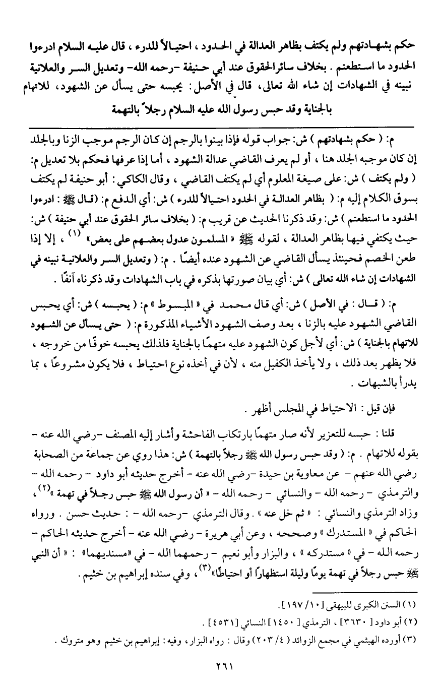 حكم بشهادتهم ولم يكتف بظاهر العدالة في الحدود، احتيالا للدرء، قال - عَلَيْهِ السَّلَامُ - «ادرءوا الحدود ما استطعتم» . بخلاف سائر الحقوق عند أبي حنيفة - رَحِمَهُ اللَّهُ - وتعديل السر والعلانية نبينه في الشهادات إن شاء الله تعالى، قال في الأصل: يحبسه حتى يسأل عن الشهود، للاتهام بالجناية وقد «حبس رسول الله - عَلَيْهِ السَّلَامُ - رجلا بالتهمة» .