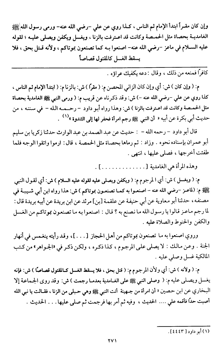 وروي «اصنعوا به ما تصنعون بموتاكم من أهل الحجاز [ ... ] ، وقد رأيته ينغمس في أنهار الجنة» . وعن مالك: لا يصلى على المرجوم، كذا ذكره، ولكن ذكر في " الجواهر " من كتب المالكية غسل وصلي عليه.