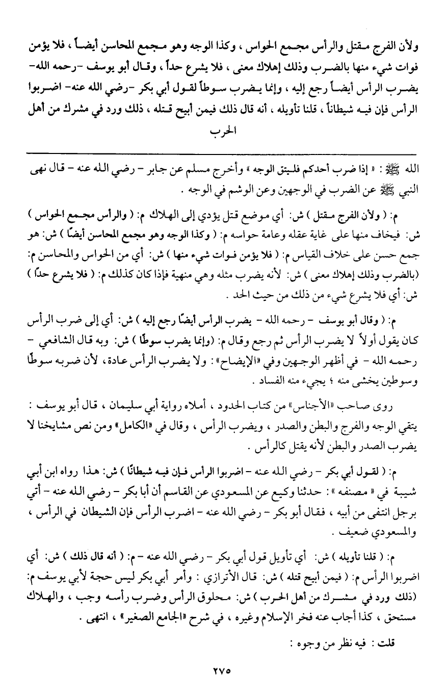 ـــــــــــــــــــــــــــــQالله - صَلَّى اللَّهُ عَلَيْهِ وَسَلَّمَ -: «إذا ضرب أحدكم فليتق الوجه» وأخرج مسلم عن جابر - رَضِيَ اللَّهُ عَنْهُ - قال «نهى النبي - صَلَّى اللَّهُ عَلَيْهِ وَسَلَّمَ - عن الضرب في الوجهين وعن الوشم في الوجه.»