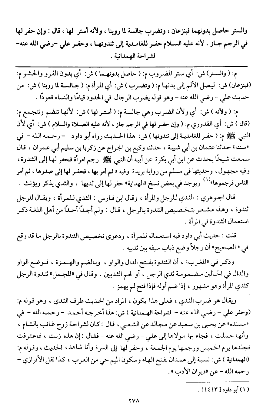 ويقال هو ضرب الثدي، فعلى هذا يكون، المراد من الحديث طرف الثدي، وهو قوله م: (وحفر علي - رَضِيَ اللَّهُ عَنْهُ - لشراحة الهمدانية) ش: هذا أخرجه أحمد - رَحِمَهُ اللَّهُ - في " مسنده " عن يحيى بن سعيد عن مجالد عن الشعبي، قال: كان لشراحة زوج غائب بالشام، وأنها حملت، فجاء بها مولاها إلى علي - رَضِيَ اللَّهُ عَنْهُ - فقال: إن هذه زنت، فاعترفت فجلدها يوم الخميس ورجمها يوم الجمعة، وحفر لها إلى السرة وأنا شاهد، الحديث، وقوله م: (الهمدانية) ش: نسبة إلى همدان بفتح الهاء وسكون الميم حي من العرب، كذا نقل الأترازي - رَحِمَهُ اللَّهُ - عن " ديوان الأدب ".
