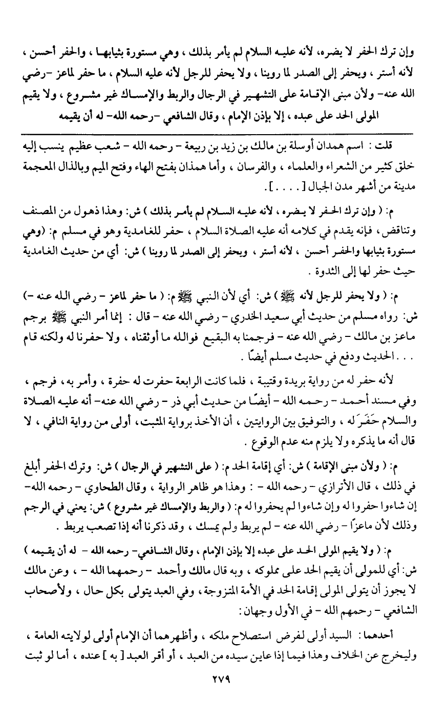 وإن ترك الحفر لا يضره، لأنه - عَلَيْهِ السَّلَامُ - لم يأمر بذلك، وهي مستورة بثيابها، والحفر أحسن، لأنه أستر، ويحفر إلى الصدر لما روينا، ولا يحفر للرجل لأنه - عَلَيْهِ السَّلَامُ -، ما حفر لماعز - رَضِيَ اللَّهُ عَنْهُ - ولأن مبنى الإقامة على التشهير في الرجال، والربط والإمساك غير مشروع،