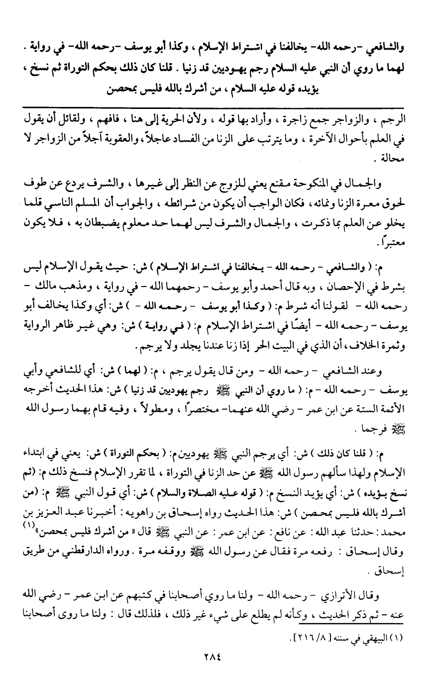 والشافعي - رَحِمَهُ اللَّهُ - يخالفنا في اشتراط الإسلام، وكذا أبو يوسف - رَحِمَهُ اللَّهُ - في رواية. لهما ما روي «أن النبي - عَلَيْهِ السَّلَامُ - رجم يهوديين قد زنيا» . قلنا كان ذلك بحكم التوراة ثم نسخ، يؤيده قوله - عَلَيْهِ السَّلَامُ -، «من أشرك بالله فليس بمحصن» .