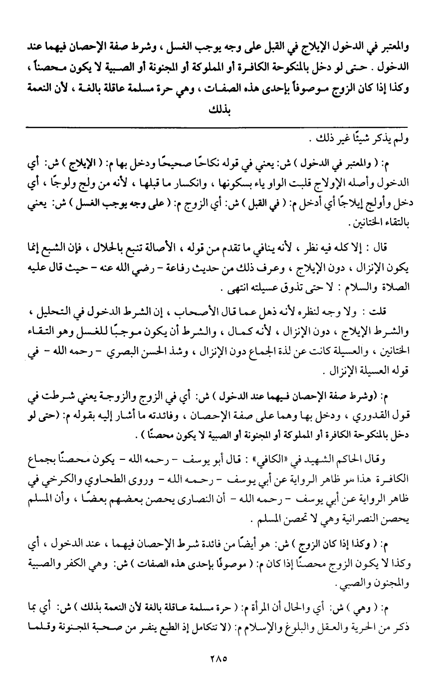 والمعتبر في الدخول الإيلاج في القبل على وجه يوجب الغسل، وشرط صفة الإحصان فيهما عند الدخول. حتى لو دخل بالمنكوحة الكافرة أو المملوكة أو المجنونة أو الصبية لا يكون محصنا، وكذا إذا كان الزوج موصوفا بإحدى هذه الصفات، وهي حرة مسلمة عاقلة بالغة، لأن النعمة بذلك