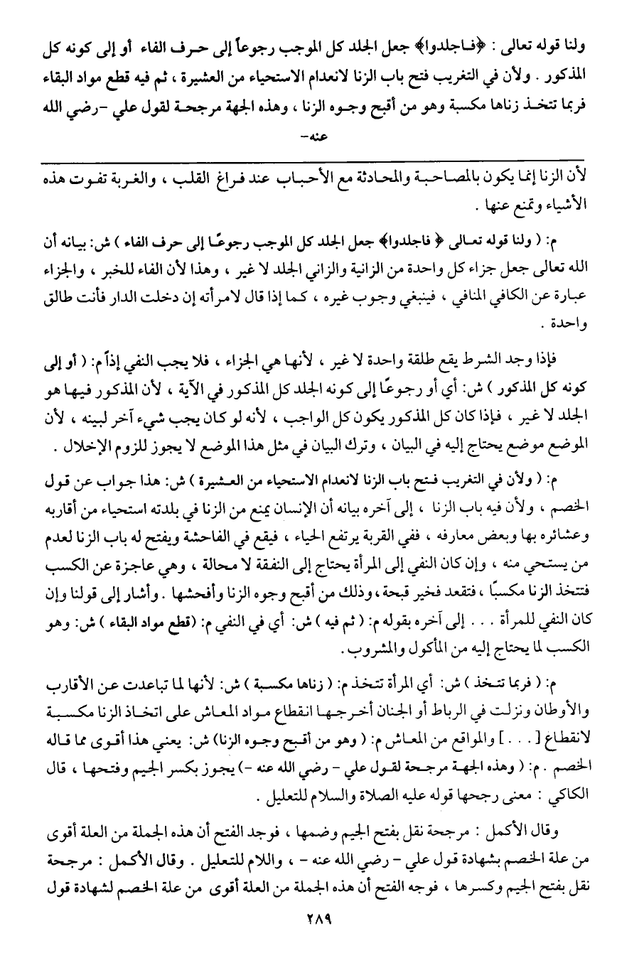ولنا قَوْله تَعَالَى {فَاجْلِدُوا} [النور: 2] جعل الجلد كل الموجب رجوعا إلى حرف الفاء أو إلى كونه كل المذكور. ولأن في التغريب فتح باب الزنا لانعدام الاستحياء من العشيرة، ثم فيه قطع مواد البقاء فربما تتخذ زناها مكسبة وهو من أقبح وجوه الزنا، وهذه الجهة مرجحة لقول علي - رَضِيَ اللَّهُ عَنْهُ -