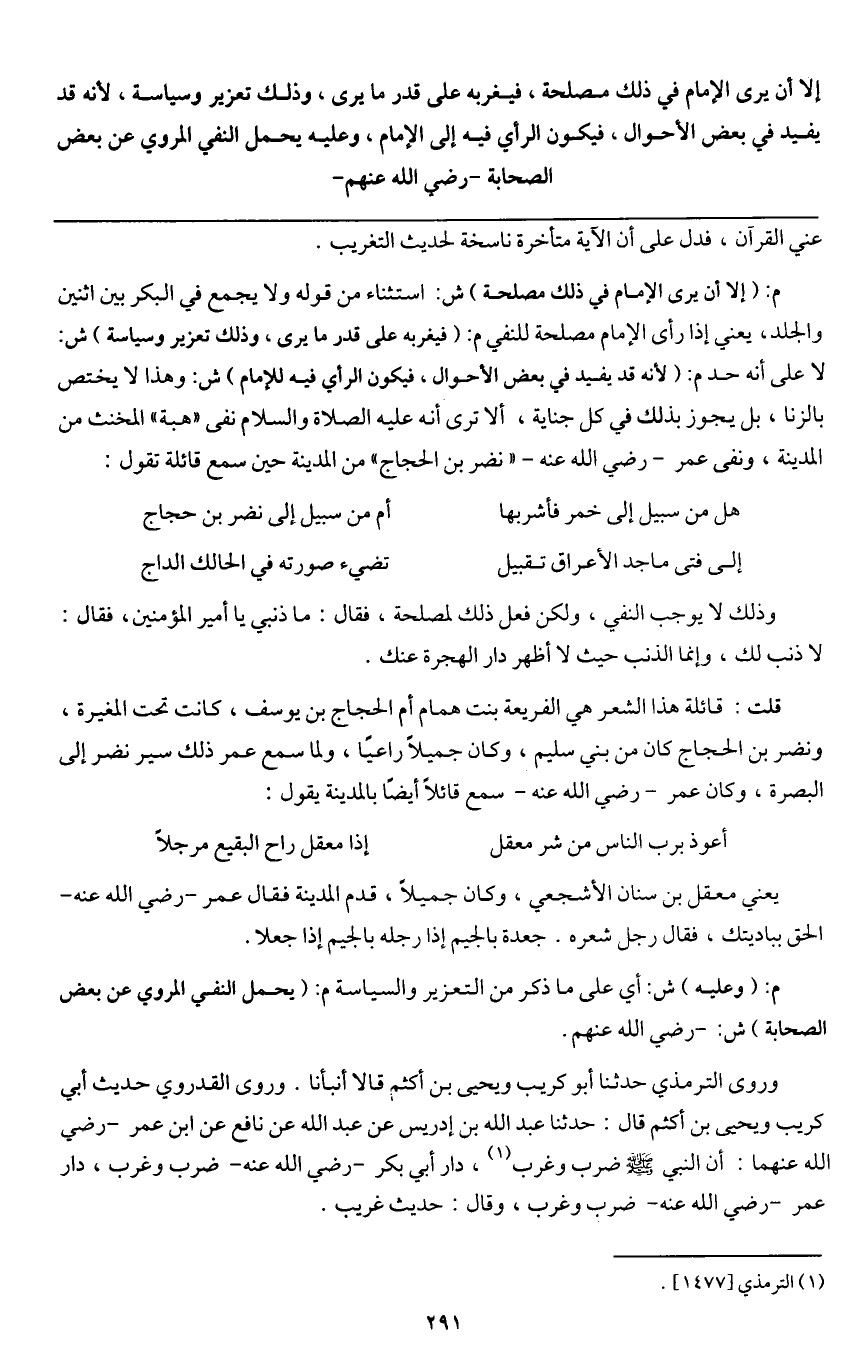إلا أن يرى الإمام في ذلك مصلحة، فيغربه على قدر ما يرى، وذلك تعزير وسياسة، لأنه قد يفيد في بعض الأحوال، فيكون الرأي فيه إلى الإمام، وعليه يحمل النفي المروي عن بعض الصحابة - رَضِيَ اللَّهُ عَنْهُمْ -.