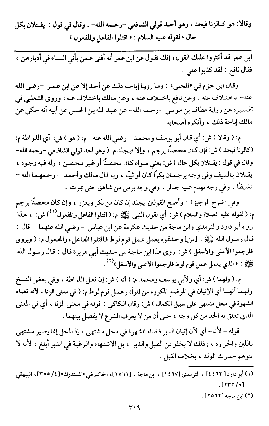 م: (وقالا) ش: أي قال أبو يوسف ومحمد - رَضِيَ اللَّهُ عَنْهُ - م: (هو) ش: أي اللواطة م: (كالزنا فيحد) ش: فإن كان محصنا يرجم، وإلا فيجلد م: (وهو أحد قولي الشافعي - رَحِمَهُ اللَّهُ - وقال في قول: يقتلان بكل حال) ش: يعني سواء كان محصنا أو غير محصن، وله فيه وجوه، يقتلان بالسيف وفي وجه يرجمان بكرا كان أو ثيبا، وبه قال مالك وأحمد - رحمهما الله - تغليظا. وفي وجه يهدم عليه جدار. وفي وجه يرمى من شاهق حتى يموت.