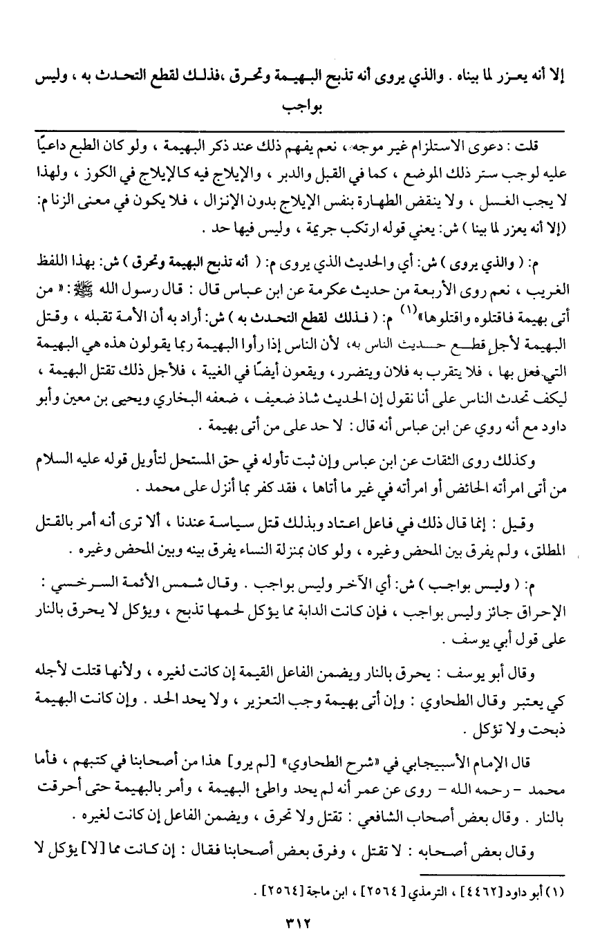 قال الإمام الأسبيجابي في " شرح الطحاوي " [لم يرو] هذا من أصحابنا في كتبهم، فأما محمد - رَحِمَهُ اللَّهُ - روى عن عمر أنه لم يحد واطئ البهيمة، وأمر بالبهيمة حتى أحرقت بالنار. وقال بعض أصحاب الشافعي: تقتل ولا تحرق، ويضمن الفاعل إن كانت لغيره.