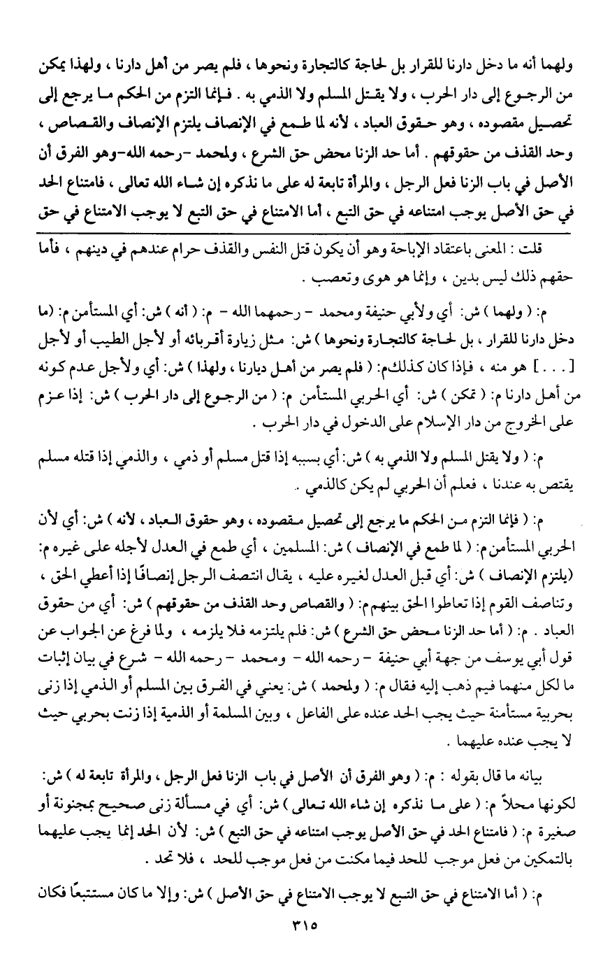 ولهما أنه ما دخل دارنا للقرار بل لحاجة كالتجارة ونحوها، فلم يصر من أهل دارنا، ولهذا يمكن من الرجوع إلى دار الحرب، ولا يقتل المسلم ولا الذمي به. فإنما التزم من الحكم ما يرجع إلى تحصيل مقصوده، وهو حقوق العباد، لأنه لما طمع في الإنصاف يلتزم الإنصاف والقصاص، وحد القذف من حقوقهم. أما حد الزنا محض حق الشرع، ولمحمد - رَحِمَهُ اللَّهُ - وهو الفرق أن الأصل في باب الزنا فعل الرجل، والمرأة تابعة له على ما نذكره إن شاء الله تعالى، فامتناع الحد في حق الأصل يوجب امتناعه في حق التبع، أما الامتناع في حق التبع لا يوجب الامتناع في حق