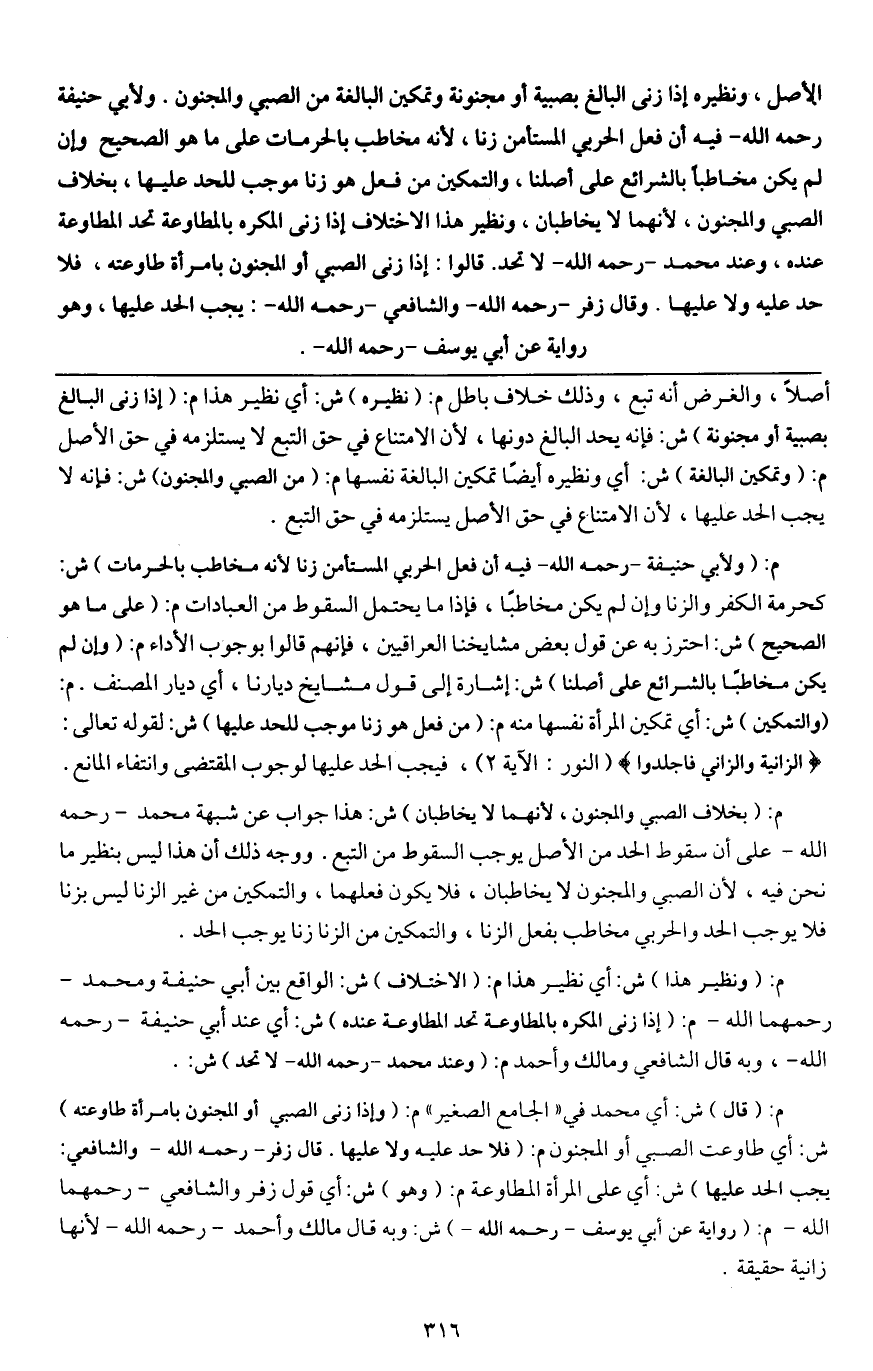 الأصل، ونظيره إذا زنى البالغ بصبية أو مجنونة وتمكين البالغة من الصبي والمجنون. ولأبي حنيفة - رَحِمَهُ اللَّهُ - فيه أن فعل الحربي المستأمن زنا، لأنه مخاطب بالحرمات على ما هو الصحيح وإن لم يكن مخاطبا بالشرائع على أصلنا، والتمكين من فعل هو زنا موجب للحد عليها، بخلاف الصبي والمجنون، لأنهما لا يخاطبان، ونظير هذا الاختلاف إذا زنى المكره بالمطاوعة تحد المطاوعة عنده، وعند محمد - رَحِمَهُ اللَّهُ - لا تحد. قالوا: إذا زنى الصبي أو المجنون بامرأة طاوعته، فلا حد عليه ولا عليها. وقال زفر - رَحِمَهُ اللَّهُ - والشافعي - رَحِمَهُ اللَّهُ -: يجب الحد عليها، وهو رواية عن أبي يوسف - رَحِمَهُ اللَّهُ -.