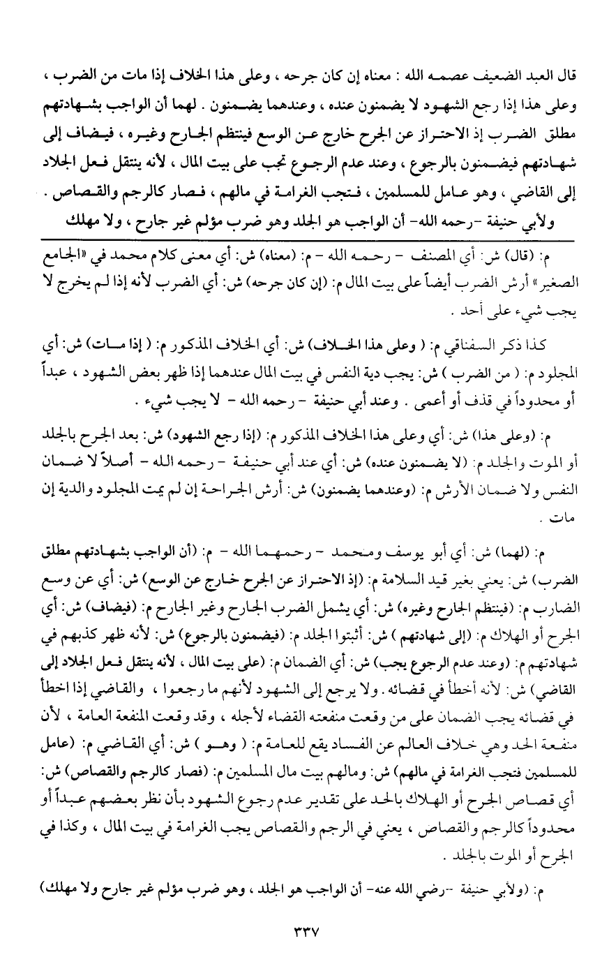 قال العبد الضعيف عصمه الله: معناه إن كان جرحه، وعلى هذا الخلاف إذا مات من الضرب، وعلى هذا إذا رجع الشهود لا يضمنون عنده، وعندهما يضمنون. لهما أن الواجب بشهادتهم مطلق الضرب إذ الاحتراز عن الجرح خارج عن الوسع فينتظم الجارح وغيره، فيضاف إلى شهادتهم فيضمنون بالرجوع، وعند عدم الرجوع تجب على بيت المال، لأنه ينتقل فعل الجلاد إلى القاضي، وهو عامل للمسلمين، فتجب الغرامة في مالهم، فصار كالرجم والقصاص. ولأبي حنيفة - رَحِمَهُ اللَّهُ - أن الواجب هو الجلد وهو ضرب مؤلم غير جارح، ولا مهلك