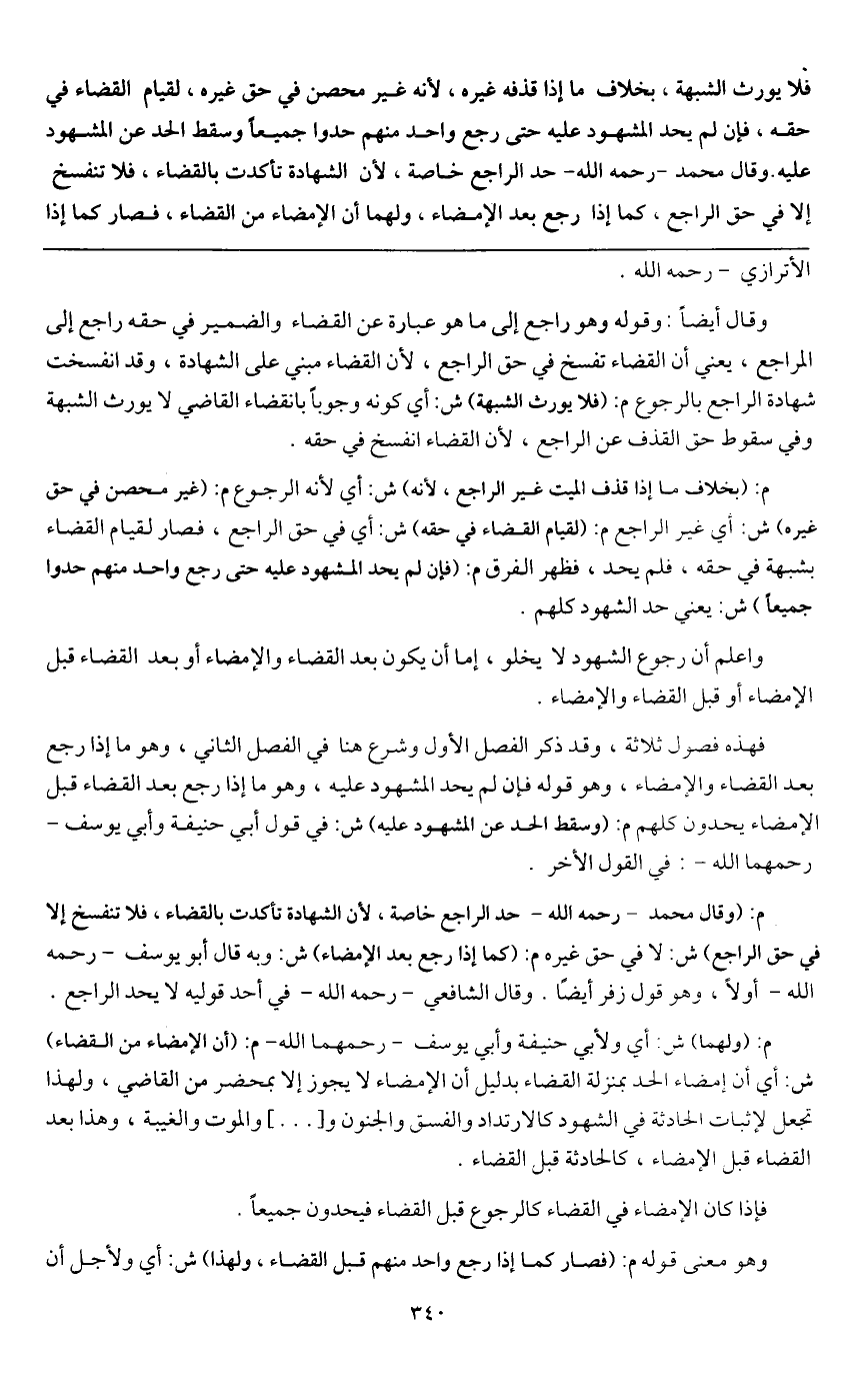 وقال أيضا: وقوله وهو راجع إلى ما هو عبارة عن القضاء، والضمير في حقه راجع إلى المراجع، يعني أن القضاء تفسخ في حق الراجع، لأن القضاء مبني على الشهادة، وقد انفسخت شهادة الراجع بالرجوع م: (فلا يورث الشبهة) ش: أي كونه وجوبا بانقضاء القاضي لا يورث الشبهة وفي سقوط حق القذف عن الراجع، لأن القضاء انفسخ في حقه.