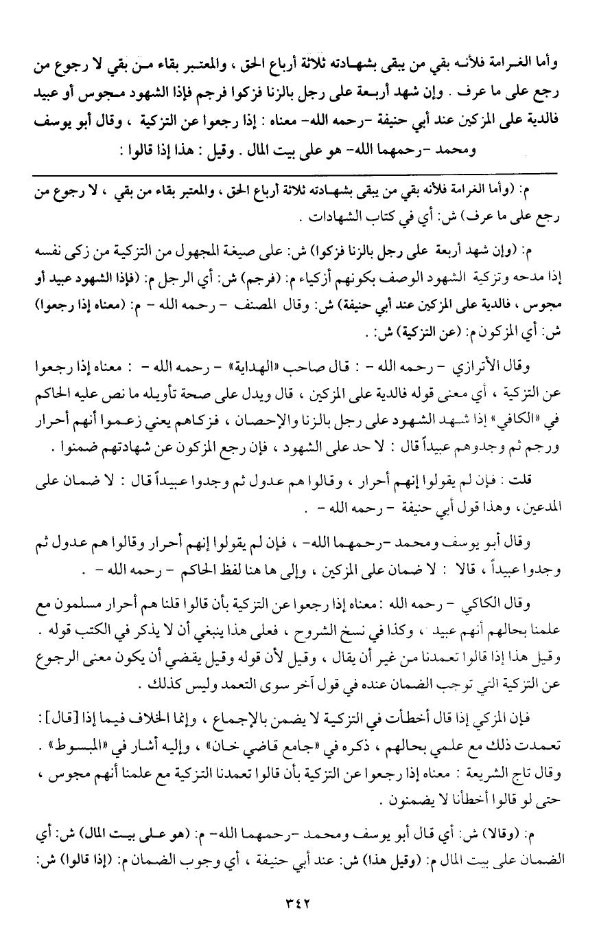 وإن شهد أربعة على رجل بالزنا فزكوا فرجم فإذا الشهود مجوس أو عبيد فالدية على المزكين عند أبي حنيفة - رَحِمَهُ اللَّهُ - معناه: إذا رجعوا عن التزكية، وقال أبو يوسف ومحمد - رحمهما الله هو على بيت المال. وقيل هذا إذا قالوا: