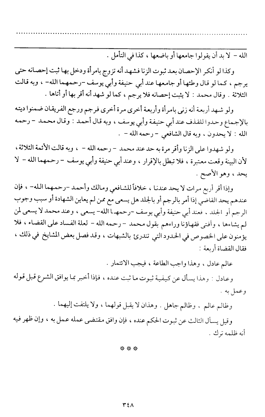 وإذا أقر أربع مرات لا يحد عندنا، خلافا للشافعي ومالك وأحمد - رحمهما الله، فإن عندهم يحد القاضي إذا أمر بالرجم أو بالجلد هل يسعى مع ممن لم يعاين الشهادة أو سبب وجوب الرجم أو الجلد، فعند أبي حنيفة وأبي يوسف - رحمهما الله يسعى، وعند محمد لا يسعى لمن لم يشاءها، وأفتى فقهاؤنا وراءهم بقول محمد - رَحِمَهُ اللَّهُ - لعلة الفساد على القضاء، فلا يؤمنون على الخصوص في الحدود التي تندرئ بالشبهات، وقد فصل بعض المشايخ في ذلك، فقال القضاة أربعة: