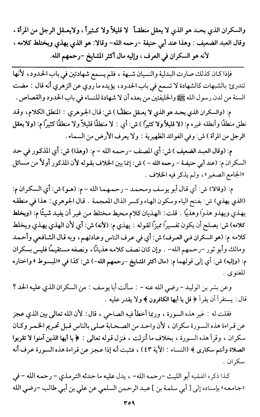 وعن بشر بن الوليد - رَضِيَ اللَّهُ عَنْهُ -: سألت أبا يوسف: من السكران الذي عليه الحد؟ قال: يستقرأ أن يقرأ {قُلْ يَا أَيُّهَا الْكَافِرُونَ} [الكافرون: 1] ولا يقدر عليه.