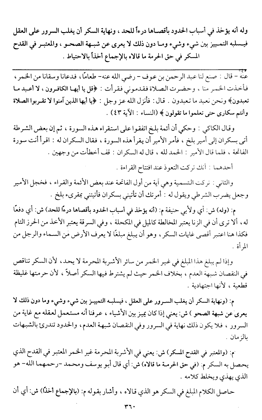 م: (ونهاية السكر أن يغلب السرور على العقل، فيسلبه التمييز بين شيء وشيء وما دون ذلك لا يعرى عن شبهة الصحو) ش: يعني إذا كان يميز بين الأشياء، عرفنا أنه مستعمل لعقله مع غاية من السرور، فلا يكون ذلك نهاية في السرور وفي النقصان شبهة العدم، والحدود تندرئ بالشبهات بالزمان.