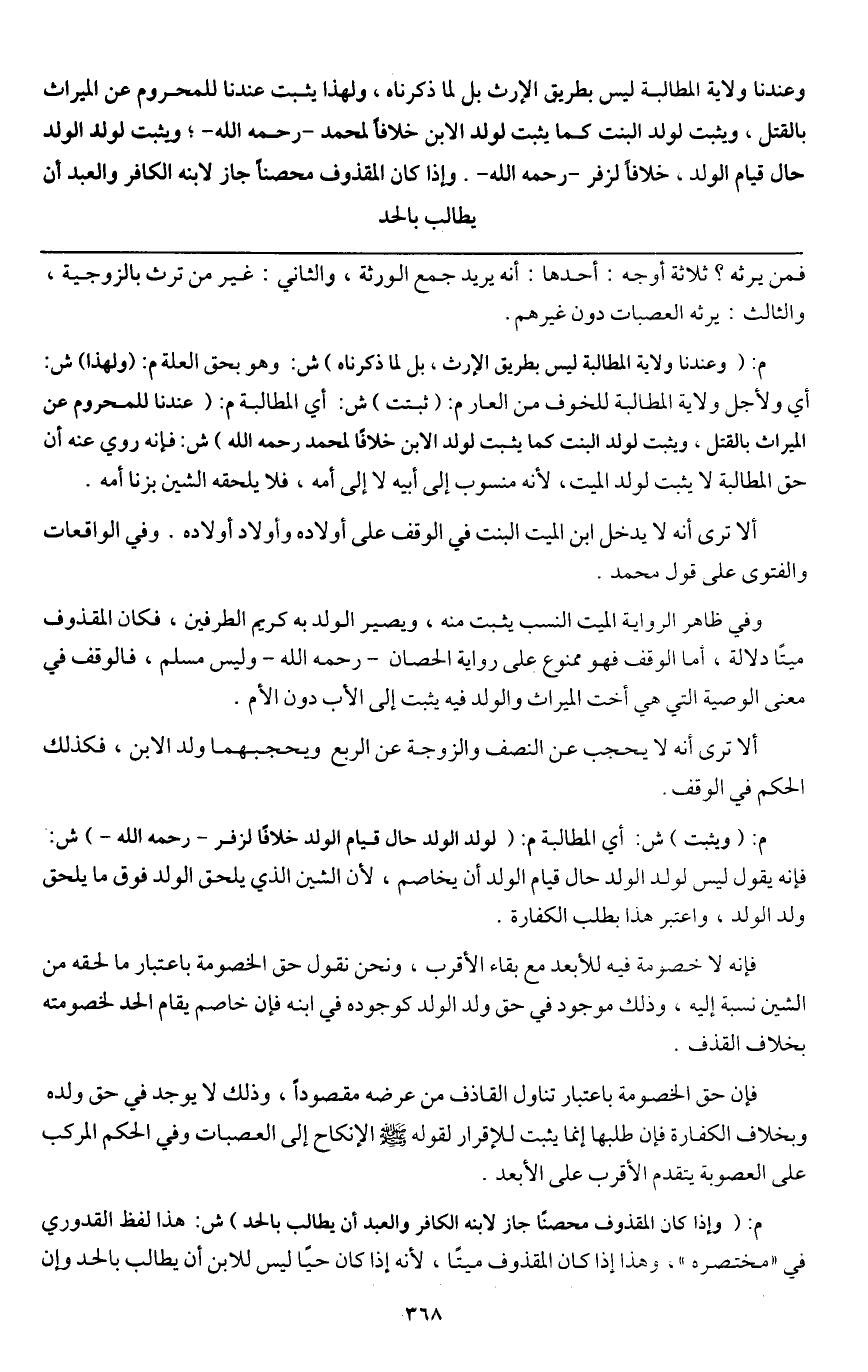م: (وعندنا ولاية المطالبة ليس بطريق الإرث، بل لما ذكرناه) ش: وهو بحق العلة م: (ولهذا) ش: أي ولأجل ولاية المطالبة للخوف من العار م: (ثبتت) ش: أي المطالبة م: (عندنا للمحروم عن الميراث بالقتل، ويثبت لولد البنت كما يثبت لولد الابن خلافا لمحمد - رَحِمَهُ اللَّهُ -) ش: فإنه روي عنه أن حق المطالبة لا يثبت لولد الميت؛ لأنه منسوب إلى أبيه لا إلى أمه، فلا يلحقه الشين بزنا أمه.