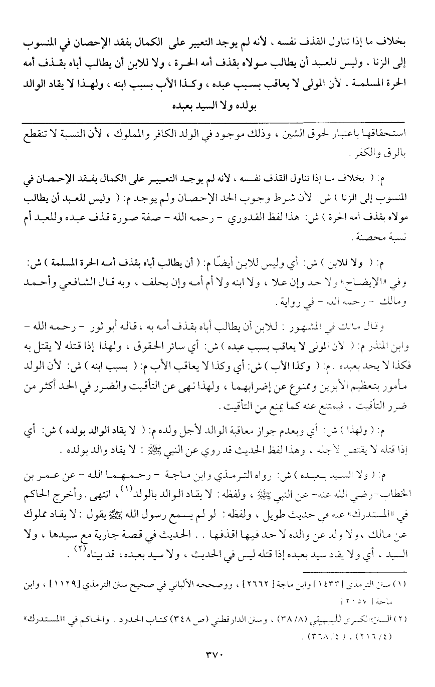 م: (ولا السيد بعبده) » ش: رواه الترمذي وابن ماجه -رحمهما الله عن عمر بن الخطاب - رَضِيَ اللَّهُ عَنْهُ - عن النبي - صَلَّى اللَّهُ عَلَيْهِ وَسَلَّمَ - ولفظه: «لا يقاد الوالد بالولد» انتهى. وأخرج الحاكم في " المستدرك " عنه في حديث طويل، ولفظه: لو لم يسمع رسول الله - صَلَّى اللَّهُ عَلَيْهِ وَسَلَّمَ - يقول: «لا يقاد مملوك عن مالك، ولا ولد عن والده لا حد فيها اقذفها» .. الحديث في قصة جارية مع سيدها، ولا السيد، أي ولا يقاد سيد بعبده إذا قتله ليس في الحديث، ولا سيد بعبده، قد بيناه.
