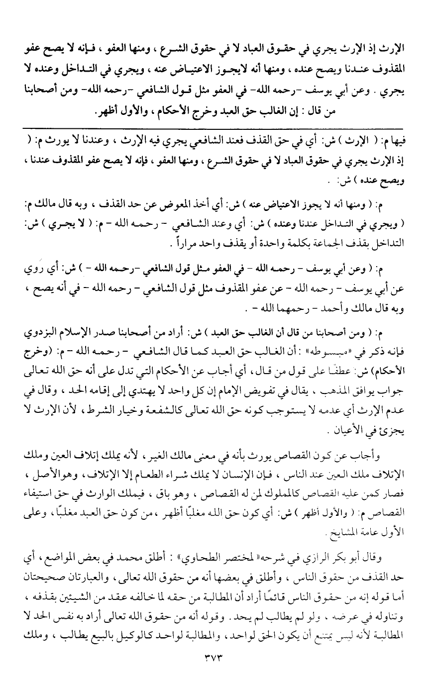 ـــــــــــــــــــــــــــــQفيها م: (الإرث) ش: أي في حق القذف فعند الشافعي يجري فيه الإرث، وعندنا لا يورث م: (إذ الإرث يجري في حقوق العباد لا في حقوق الشرع، ومنها العفو، فإنه لا يصح عفو المقذوف عندنا ويصح عنده) ش:.