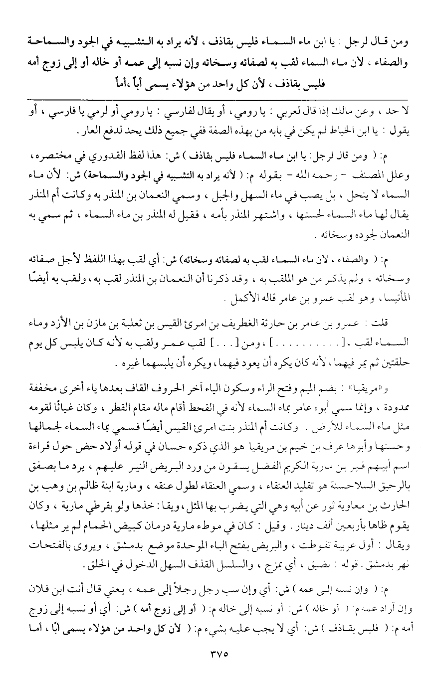 ومن قال لرجل: يا ابن ماء السماء فليس بقاذف؛ لأنه يراد به التشبيه في الجود والسماحة والصفاء؛ لأن ماء السماء لقب به لصفائه وسخائه وإن نسبه إلى عمه أو خاله أو إلى زوج أمه فليس بقاذف؛ لأن كل واحد من هؤلاء يسمى أبا، أما
