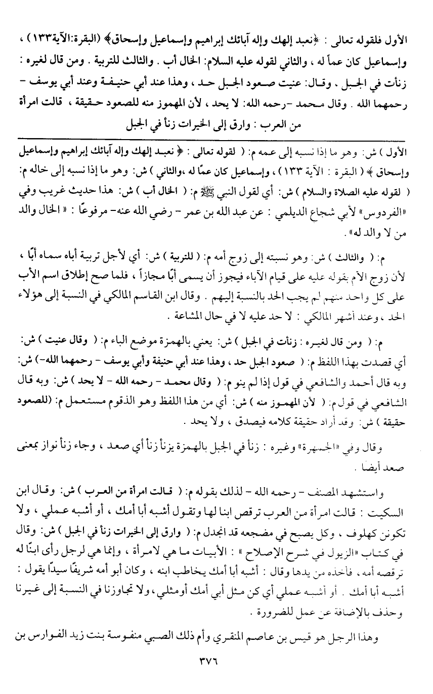 ـــــــــــــــــــــــــــــQالأول) ش: وهو ما إذا نسبه إلى عمه م: (لِقَوْلِهِ تَعَالَى: {نَعْبُدُ إِلَهَكَ وَإِلَهَ آبَائِكَ إِبْرَاهِيمَ وَإِسْمَاعِيلَ وَإِسْحَاقَ} [البقرة: 133] (البقرة: الآية 133) ، وإسماعيل كان عما له، والثاني) ش: وهو ما إذا نسبه إلى خاله م: (لقوله - عَلَيْهِ الصَّلَاةُ وَالسَّلَامُ -) ش: أي لقول النبي - صَلَّى اللَّهُ عَلَيْهِ وَسَلَّمَ - م: (الخال أب) ش: هذا حديث غريب وفي " الفردوس " لأبي شجاع الديلمي: عن عبد الله بن عمر - رَضِيَ اللَّهُ عَنْهُ - مرفوعا: «الخال والد من لا والد له» .