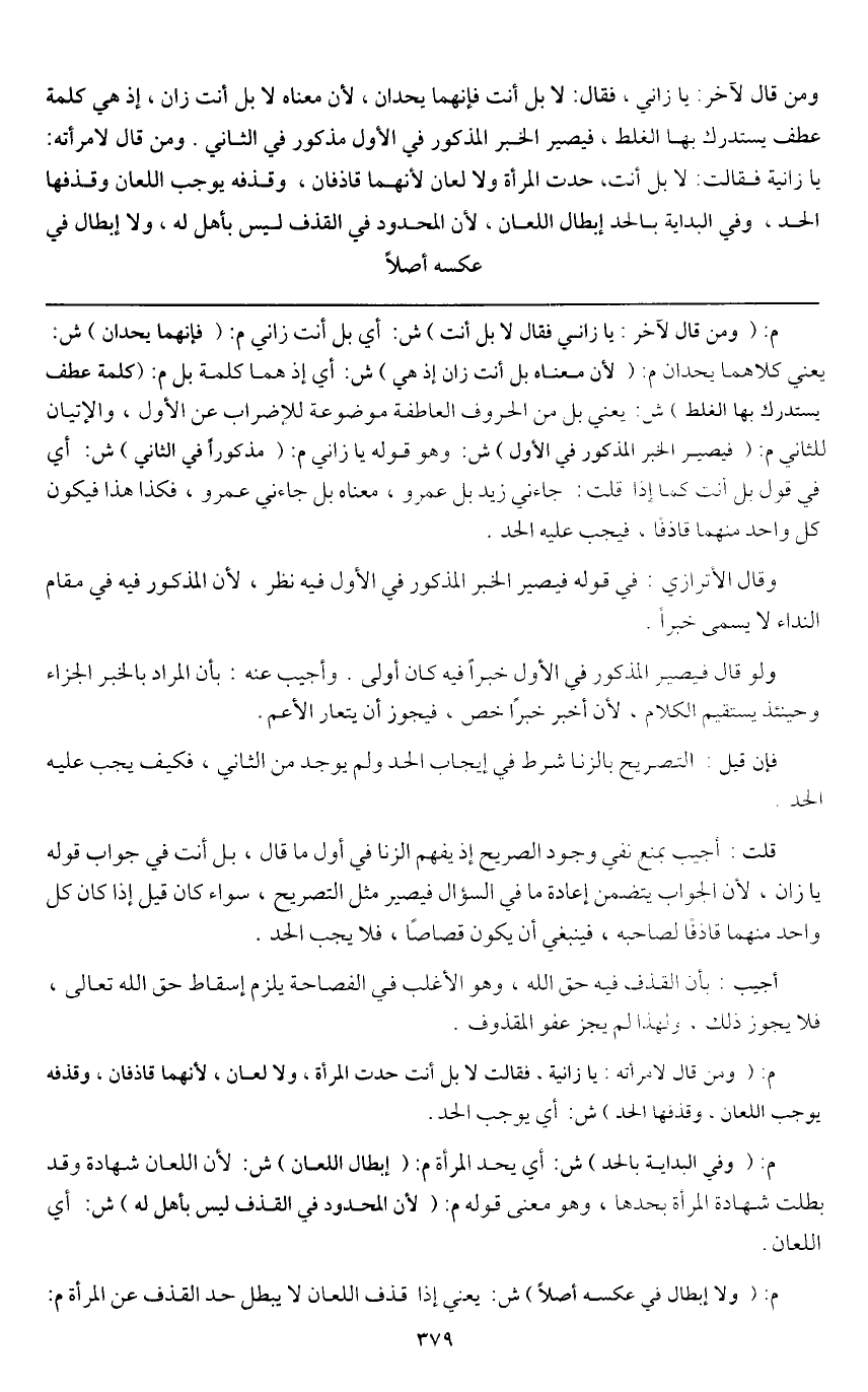 قلت: أجيب بمنع نفي وجود الصريح إذ يفهم الزنا في أول ما قال، بل أنت في جواب قوله يا زان؛ لأن الجواب يتضمن إعادة ما في السؤال فيصير مثل التصريح، سواء كان قيل إذا كان كل واحد منهما قاذفا لصاحبه، فينبغي أن يكون قصاصا، فلا يجب الحد.