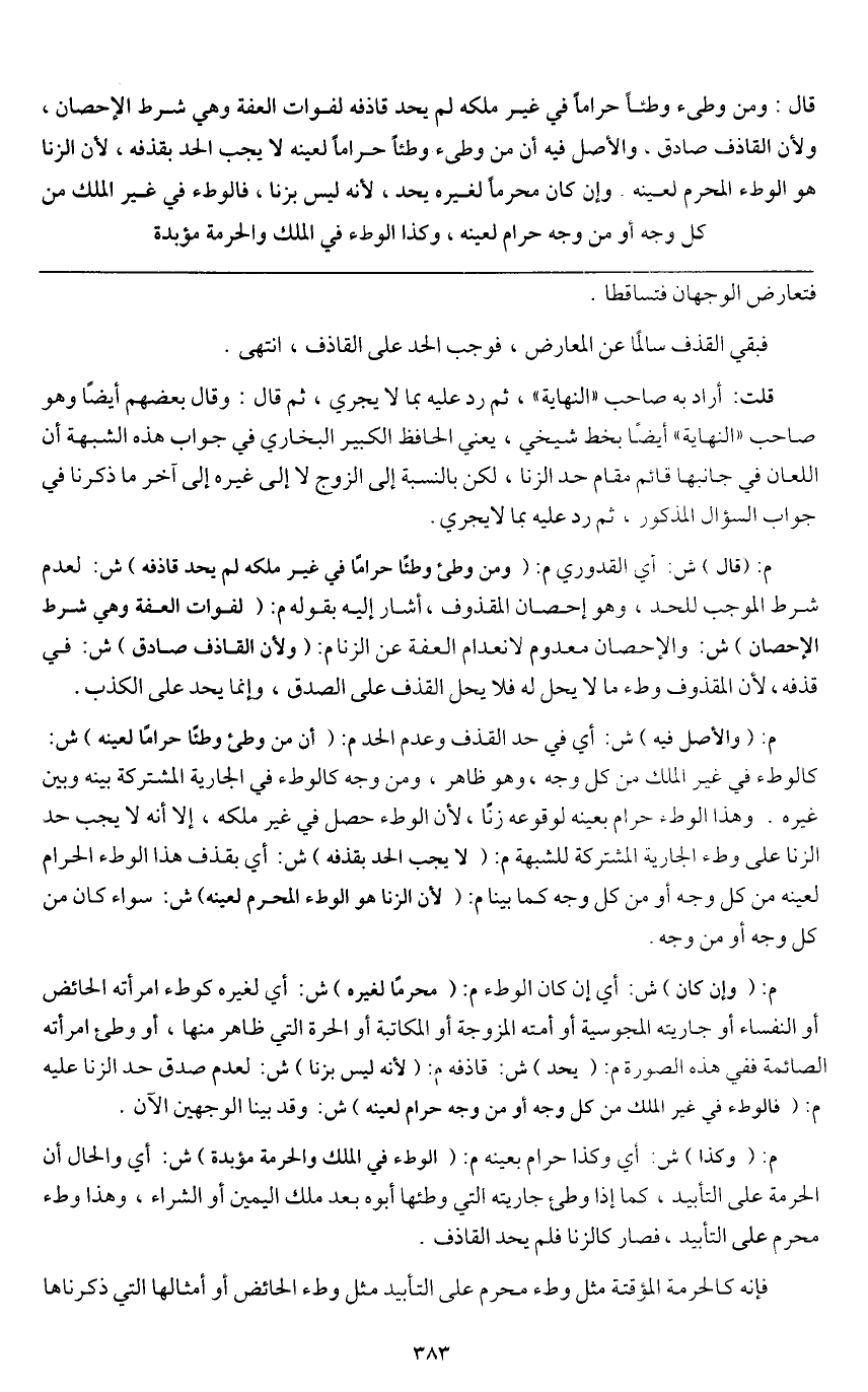 م: (والأصل فيه) ش: أي في حد القذف وعدم الحد م: (أن من وطئ وطئا حراما لعينه) ش: كالوطء في غير الملك من كل وجه، وهو ظاهر، ومن وجه كالوطء في الجارية المشتركة بينه وبين غيره. وهذا الوطء حرام بعينه لوقوعه زنا؛ لأن الوطء حصل في غير ملكه، إلا أنه لا يجب حد الزنا على وطء الجارية المشتركة للشبهة م: (لا يجب الحد بقذفه) ش: أي بقذف هذا الوطء الحرام لعينه من كل وجه أو من كل وجه كما بينا م: (لأن الزنا هو الوطء المحرم لعينه) ش: سواء كان من كل وجه أو من وجه.