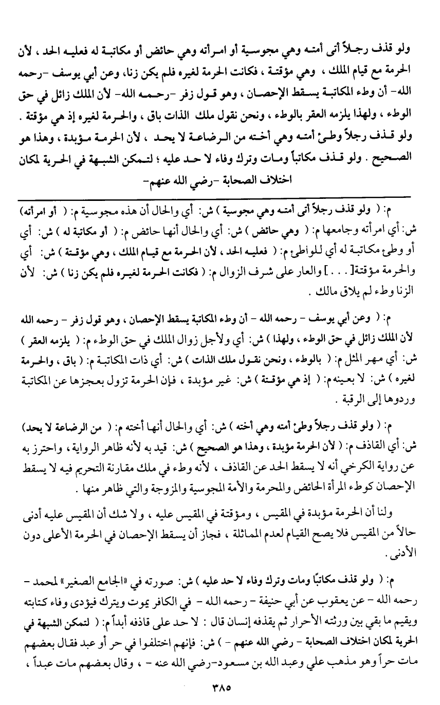 ولو قذف رجلا أتى أمته وهي مجوسية أو امرأته وهي حائض أو مكاتبة له فعليه الحد؛ لأن الحرمة مع قيام الملك، وهي مؤقتة، فكانت الحرمة لغيره فلم يكن زنا، وعن أبي يوسف - رَحِمَهُ اللَّهُ - أن وطء المكاتبة يسقط الإحصان، وهو قول زفر - رَحِمَهُ اللَّهُ - لأن الملك زائل في حق الوطء، ولهذا يلزمه العقر بالوطء، ونحن نقول ملك الذات باق، والحرمة لغيره إذ هي مؤقتة. ولو قذف رجلا وطئ أمته وهي أخته من الرضاعة لا يحد؛ لأن الحرمة مؤبدة، وهذا هو الصحيح.