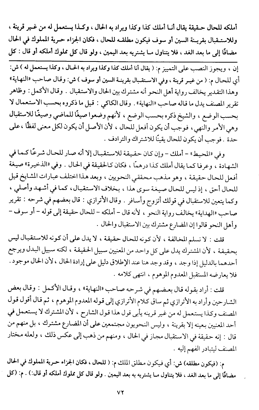 وفي " المحيط " - أملك - وإن كان حقيقة للاستقبال إلا أنه صار للحال شرعاً كما في الشهادة، وعرفاً كما يقال أملك كذا درهماً، فكان كالحقيقة في الحال. وفي " الذخيرة " صيغة أفعل للحال حقيقة، وهو مذهب محققي النحويين، وبعد هذا اختلف عبارات المشايخ قيل للحال أحق، إذ ليس للحال صيغة سوى هذا، بخلاف الاستقبال، كما في أشهد وأصلي، وكما يتعين للاستقبال في قولك أتزوج وأسافر. وقال الأترازي: قال بعضهم في شرحه: تقرير صاحب " الهداية " يخالف رواية النحو، لأنه قال - أملكه - للحال حقيقة إلى قوله - أو سوف - وأهل النحو قالوا إن المضارع مشترك بين الاستقبال والحال.