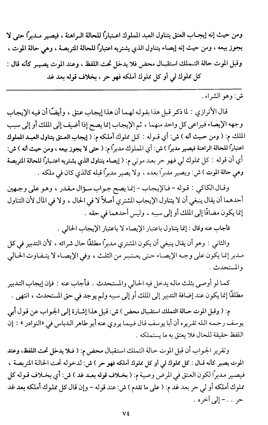 م: (وقبل الموت حالة التملك استقبال محض) . ش: قيل هذا إشارة إلى الجواب عن قول أبي يوسف - رَحِمَهُ اللَّهُ - تقريره أن أبا يوسف قال فيما يروي عنه أبو طاهر الدباس في " النوادر ": إن اللفظ حقيقة للحال فلا يعتق به ما يستملكه.