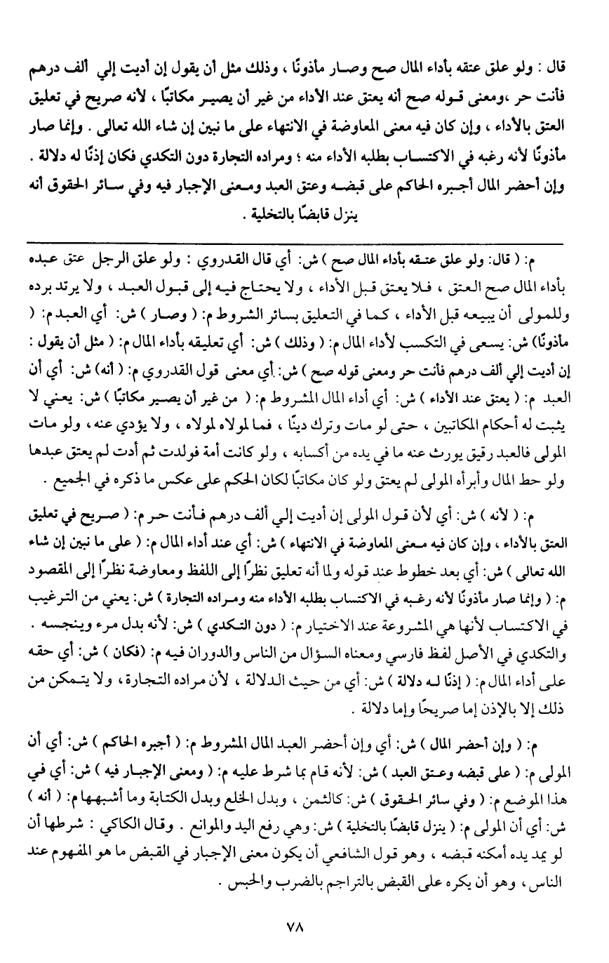 م: (وإن أحضر المال) . ش: أي وإن أحضر العبد المال المشروط. م: (أجبره الحاكم) . ش: أي أن المولى. م: (على قبضه وعتق العبد) . ش: لأنه قام بما شرط عليه. م: (ومعنى الإجبار فيه) . ش: أي في هذا الموضع. م: (وفي سائر الحقوق) . ش: كالثمن، وبدل الخلع وبدل الكتابة وما أشبهها. م: (أنه) . ش: أي أن المولى. م: (ينزل قابضا بالتخلية) . ش: وهي رفع اليد والموانع. وقال الكاكي: شرطها أن لو يمد يده أمكنه قبضه، وهو قول الشافعي أن يكون معنى الإجبار في القبض ما هو المفهوم عند الناس، وهو أن يكره على القبض بالتراجم بالضرب والحبس.
