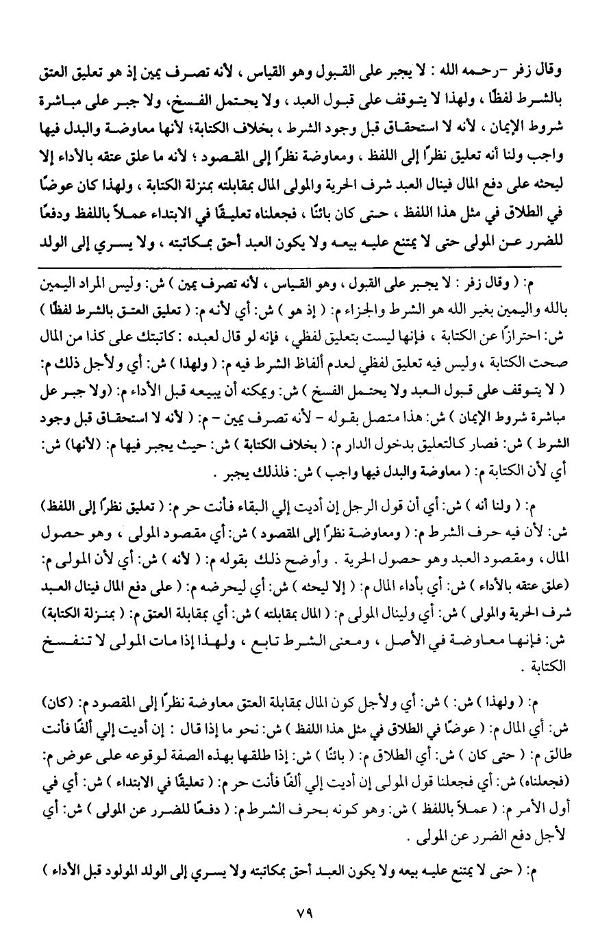 وقال زفر - رَحِمَهُ اللَّهُ -: لا يجبر على القبول وهو القياس، لأنه تصرف يمين إذ هو تعليق العتق بالشرط لفظا، ولهذا لا يتوقف على قبول العبد، ولا يحتمل الفسخ، ولا جبر على مباشرة شروط الإيمان، لأنه لا استحقاق قبل وجود الشرط، بخلاف الكتابة؛ لأنها معاوضة والبدل فيها واجب ولنا أنه تعليق نظرا إلى اللفظ، ومعاوضة نظرا إلى المقصود؛ لأنه ما علق عتقه بالأداء إلا ليحثه على دفع المال فينال العبد شرف الحرية والمولى المال بمقابلته بمنزلة الكتابة، ولهذا كان عوضا في الطلاق في مثل هذا اللفظ، حتى كان بائنا، فجعلناه تعليقا في الابتداء عملا باللفظ ودفعا للضرر عن المولى حتى لا يمتنع عليه بيعه ولا يكون العبد أحق بمكاتبته، ولا يسري إلى الولد