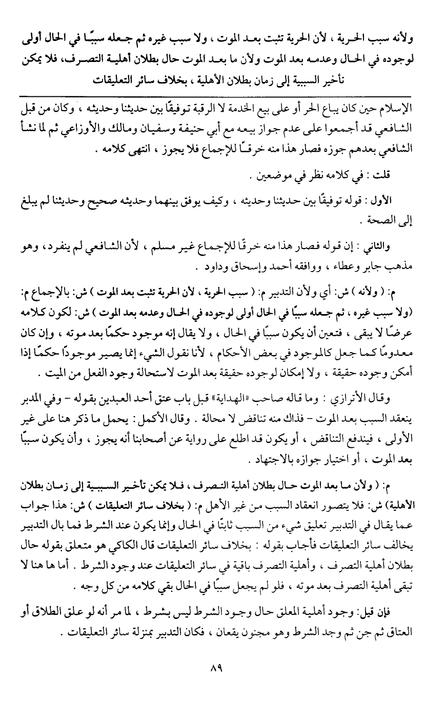 ولأنه سبب الحرية، لأن الحرية تثبت بعد الموت، ولا سبب غيره ثم جعله سببا في الحال أولى لوجوده في الحال وعدمه بعد الموت ولأن ما بعد الموت حال بطلان أهلية التصرف، فلا يمكن تأخير السببية إلى زمان بطلان الأهلية، بخلاف سائر التعليقات.