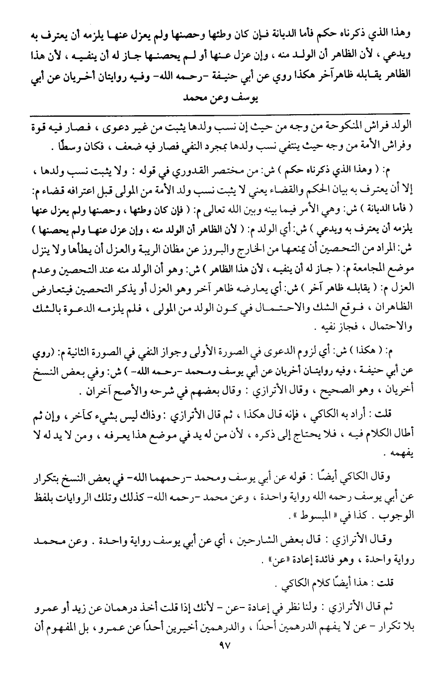ـــــــــــــــــــــــــــــQالولد فراش المنكوحة من وجه من حيث إن نسب ولدها يثبت من غير دعوى، فصار فيه قوة وفراش الأمة من وجه حيث ينتفي نسب ولدها بمجرد النفي فصار فيه ضعف، فكان وسطاً.